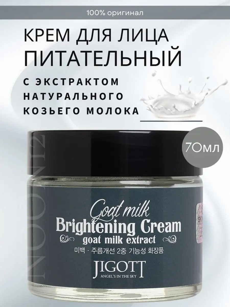 JIGOTT GOAT MILK BRIGHTENING CREAM, a goat milk face cream for men and women that brightens age spots, is enriched with natural goat milk extract. It provides nourishment and hydration, maintaining a healthy appearance. Milk proteins not only renew the epidermis but also stimulate the growth of new cells. This cream is suitable for dehydrated skin showing the first signs of aging. Lactic acid is responsible for eliminating pigmentation and overall skin brightening. Goat milk proteins saturate the skin with vitamins, minerals, proteins, fatty acids, and amino acids, nourishing, moisturizing, and softening it, accelerating collagen synthesis, preventing premature aging, increasing firmness and elasticity, and have a pronounced regenerating and soothing effect, lightening pigmentation and post-acne marks. Niacinamide stimulates collagen synthesis, ceramide, and lipid production, helping to lighten pigmentation of various origins. This anti-aging lifting face cream with snail mucin slows skin aging thanks to its antioxidant properties, reduces the depth of expression wrinkles, evens out skin texture, and restores elasticity and firmness. Snail mucus extract has a rejuvenating effect, stimulating the production of collagen and elastin. Snail mucin reduces pigmentation and has anti-inflammatory and wound-healing properties. Niacinamide promotes cellular renewal in mature skin, leaving it fresher and more elastic. Aloe vera extract perfectly cleanses clogged pores and removes dead skin cells, giving skin a healthy, radiant appearance. HOW TO USE: Apply a small amount of cream to the face and neck, gently patting it into the skin.