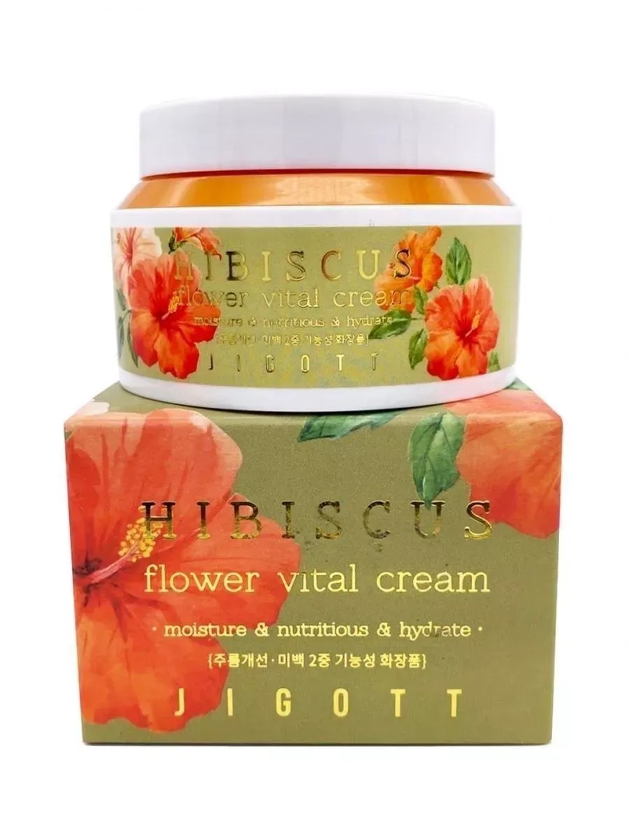 Anti-aging face cream with hibiscus extract from the South Korean natural cosmetics brand Jigott is designed for skin showing signs of aging. It is part of the signature line of cosmetic products created with plant-based flower peptides. The hibiscus-based formula intensively nourishes, moisturizes, smoothes, and restores the skin, has a relaxing effect on excessive muscle tone, actively combats the first signs of aging, and has anti-inflammatory properties. The product smoothes and softens the skin, tones, activates cell regeneration processes, eliminates redness and puffiness, reduces the appearance of rosacea, and eliminates signs of fatigue and stress. The cream improves the firmness and elasticity of the skin and prevents dryness. It does not contain alcohol, mineral oil, or parabens. Directions for use: Apply a small amount of cream evenly to clean and toned skin of the face and neck with gentle movements. Wait until the product is completely absorbed.