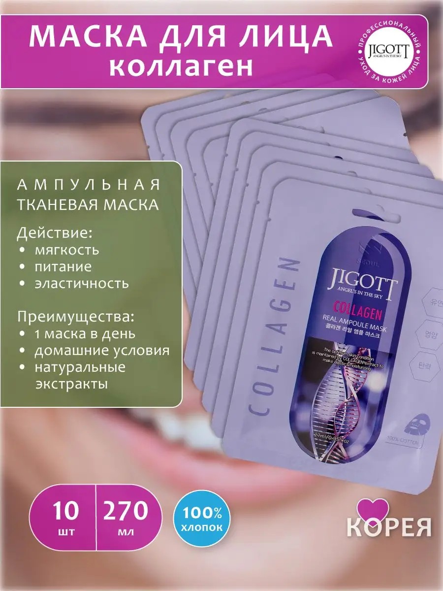 Маска для лица тканевая JIGOTT COLLAGEN REAL AMPOULE MASK с коллагеном позволит коже лица выглядеть сияющей, молодой и свежей. Коллаген обеспечивает прочность и эластичность кожи, а маска с коллагеном помогает ее увлажнить и существенно повысить эластичность, уменьшить морщины и другие признаки старения кожи.
