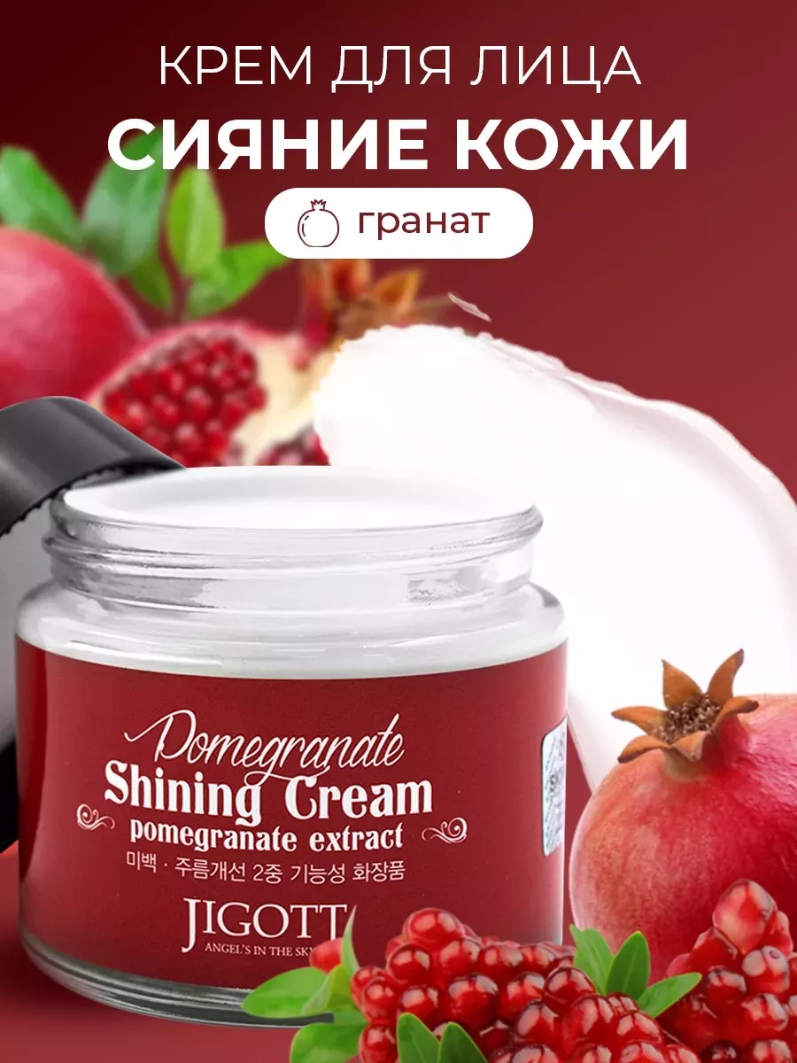 Питательный антивозрастной крем для лица Jigott С ГРАНАТОМ Pomegranate Shining - это настоящая витаминовая бомба.Эта профессиональная корейская косметика с экстрактом граната, витаминами и коллагеном, изготовленная в Korea, предназначена для увлажнения, питания и омолаживания кожи, помогает справиться с различными проблемами, такими как прыщи, черные точки, морщины, пигментация и акне. Это универсальное средство, которое можно использовать в качестве ночного и дневного крема для лица, шеи и зоны декольте. Рекомендуется для зрелой и тусклой кожи (30+, 35+, 45+, 50+). Экстракт граната обладает ярко выраженным лифтинг действием, стимулирует процесс регенерации и синтез собственного коллагена, ускоряет микроциркуляцию крови и заживление, выводит токсины, способствует осветлению пигментации различного происхождения и пост-акне, разглаживает существующие морщины и препятствует появлению новых. Также это универсальное средство подойдёт и от чёрных точек. Антивозрастной крем имеет густую и плотную консистенцию, но через несколько минут не оставляет следов, полностью впитываясь. С его помощью вы получите подтянутую и упругую кожу лица, улучшение его текстуры и сияние. Идеален в качестве базы основы под макияж. Не солнцезащитный, без SPF защиты. СПОСОБ ПРИМЕНЕНИЯ: Наносить на очищенную, напитанную тоником кожу. Распределить по поверхности тонким слоем. Область использования - лицо и шея. Крем питательный для лица имеет легкую текстуру и быстро впитывается, не оставляя жирной пленки. Увлажняющий, омолаживающий, питательный корейский крем подойдёт для женщин и мужчин. Сделано в Корее, 100% оригинал. Профессиональная корейская косметика Джиготт - это качественные уходовые средства с уникальными и редкими компонентами для сохранения красоты и молодости кожи! Наслаждайтесь молодой, гладкой и здоровой кожей с увлажняющим и питательным гранатовым кремом.