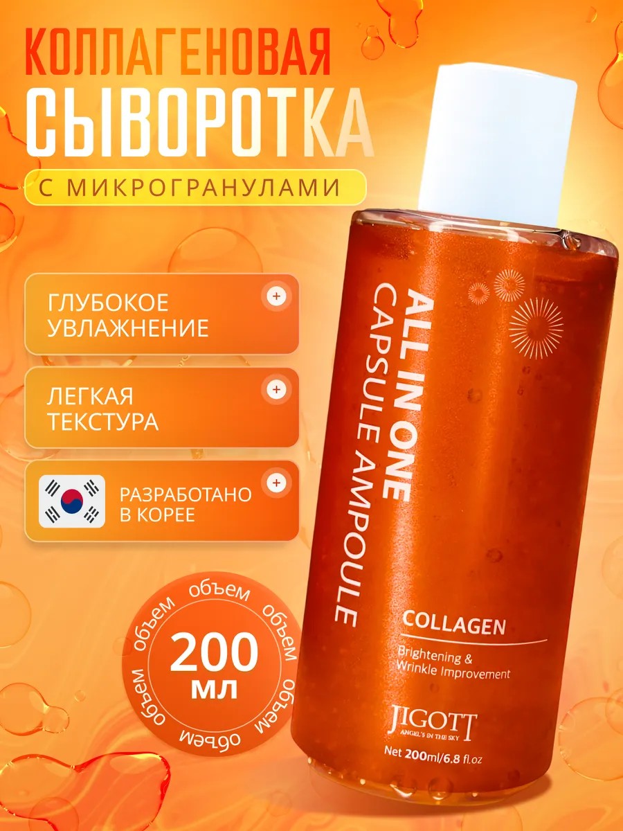 The Korean ALL-IN-ONE CAPSULE AMPOULE facial serum from the renowned brand Jigott will help you achieve beautiful, virtually perfect skin. This Korean collagen serum with melting microcapsules (200 ml) deeply moisturizes and restores moisture balance. This multifunctional anti-aging Collagen facial essence will restore radiance and well-groomed skin! This product contains concentrated, hydrolyzed collagen, which intensively moisturizes the skin and retains moisture. Collagen instantly tightens the skin, actively combats wrinkles and dryness. With regular use, this Korean facial serum helps quickly combat age-related changes and enrich the skin with vitamins and minerals. The microcapsules melt upon contact with the skin! Hyaluronic acid, contained in the capsule serum, improves the appearance of the face, adds radiance, while eliminating roughness and pigmentation. Thanks to its natural composition, this essence is suitable for sensitive and problematic skin. Collagen for the face can be used from the age of 18. Unlike cheaper alternatives, our Korean facial cosmetics are genuine and certified. This anti-aging serum has a light, unobtrusive scent. Its gel-like structure makes it very economical. This gel-like product has an organic composition and no preservatives. This facial essence is specifically designed to moisturize, nourish, and maintain the freshness and youthfulness of the skin. Collagen for the face pleasantly cools, refreshes, and tones the skin, relieves fatigue, stress, and tension, energizes tissues, and restores the smoothness, firmness, and elasticity of the epidermis. It optimizes skin moisture levels, normalizes its microflora, suppresses pathogenic microorganisms, improves circulation, and stimulates collagen production. Actively combats excess oiliness, reduces subcutaneous sebum production, tightens pores, and neutralizes unpleasant oily shine.
