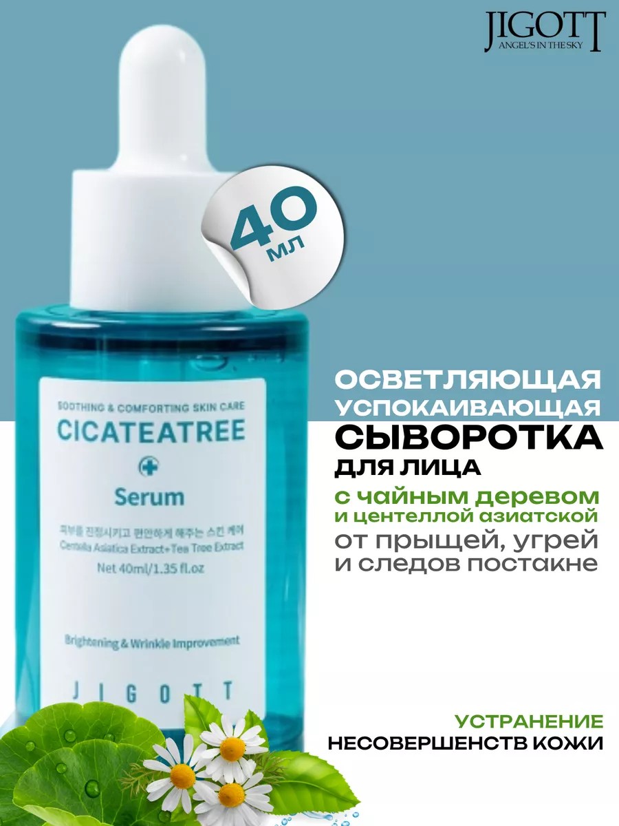 Сыворотка для лица с экстрактом центеллы азиатской и чайного дерева Cicateatree Serum южнокорейского бренда Jigott подходит для любой кожи, особенно проблемной, чувствительной, склонной к раздражению, может использоваться для области вокруг глаз. Средство имеет невесомую консистенцию, легко наносится и отлично впитывается полностью, имеет многофункциональное оздоравливающее действие. Сыворотка принадлежит фирменной коллекции косметических продуктов по уходу за кожей на основе аллантоина и органических экстрактов чайного дерева, ромашки, азиатской центеллы, шалфея и лаванды. Все средства линейки Cicateatree успокаивают, увлажняют, смягчают и разглаживают кожу, укрепляют и уплотняют её, устраняют сухость, раздражение и шелушение, тонизируют и освежают. В её состав входят также растительные экстракты гиацинта, лекарственного бурачника и синего василька. Как и другие продукты серии, она снижает чрезмерную чувствительность кожного покрова, помогает эффективно бороться с прыщами, угрями и комедонами, оказывает противовоспалительное, антисептическое и регенерирующее действие, стимулирует восстановление кожного покрова. Пенка укрепляет сосуды, активизирует обменные процессы, циркуляцию крови и заживление повреждений, выравнивает цвет и тон кожи. Успокаивающая сыворотка для лица с центеллой азиатской и чайным деревом предназначена для интенсивного увлажнения и устранения несовершенств кожи. Сыворотка снижает чувствительность кожи, обеспечивает питание и защиту. Центелла азиатская купирует воспаление, ускоряет заживление повреждений, успокаивает кожу. Увлажняет, укрепляет сосуды, убирает отечность. Чайное дерево дополнительно уничтожает бактерии, вызывающие акне и воспаление, убирает покраснение, раздражение. Корейская сыворотка обеспечивает интенсивное увлажнение всех слоев эпидермиса.