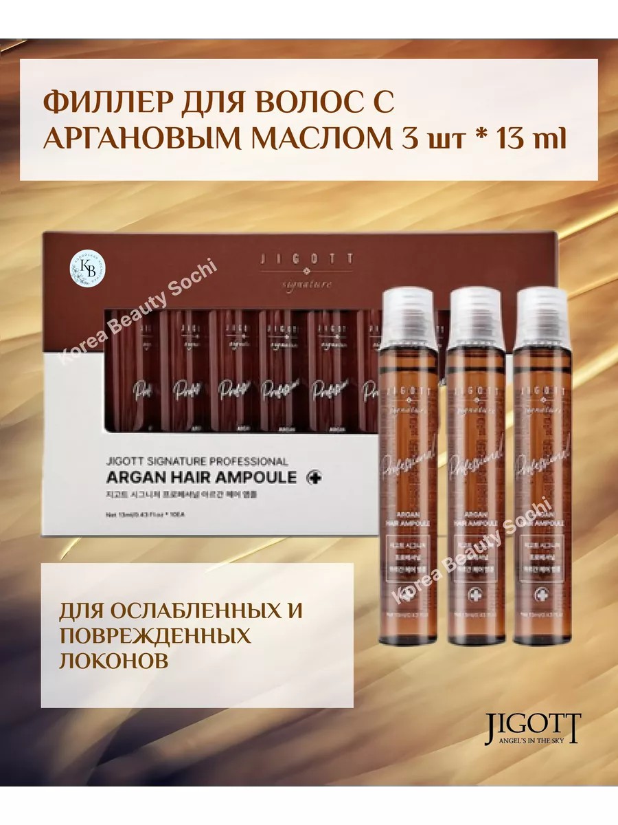 Hair filler with argan oil, 3 pcs * 13 ml. Jigott Signature Professional Argan Hair Ampoule intensively moisturizes, nourishes, and restores strands along the entire length, eliminates dryness and brittleness, reduces split ends, thickens and strengthens hair, restores shine, smoothness, and a well-groomed appearance. The serum makes curls more elastic, soft, and flexible, improving their protective properties. Key components of the formula also include organic jojoba, camellia, macadamia, and sunflower oils.