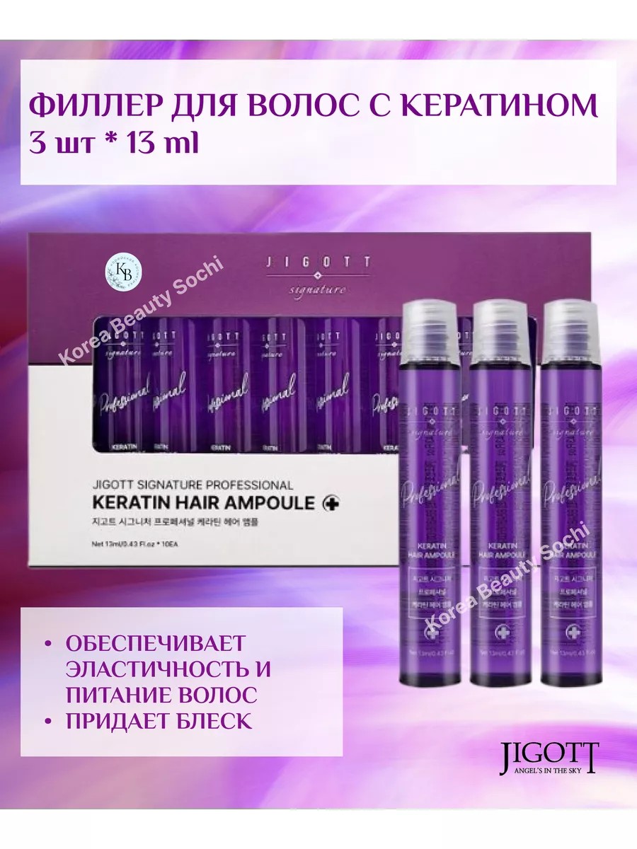 Jigott Signature Professional Keratin Hair Ampoule, a 3-pack of keratin hair fillers (13 ml), contains a complex of extracts that provide elasticity and nourishment, adding shine to hair tired from external irritants.