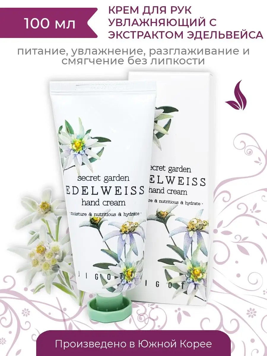 Jigott Secret Garden Edelweiss Hand Cream with Edelweiss extract provides intensive nourishment and hydration. It has a pleasant aroma and leaves hands feeling comfortable. Its key active ingredients eliminate hyperpigmentation and intensively nourish and moisturize the skin. Edelweiss extract actively promotes regenerative processes, promoting the healing of minor cracks, scratches, and wounds. It softens rough areas of the hands, leaving the skin softer and smoother, and prevents moisture loss. The cream absorbs instantly without leaving a sticky film. Suitable for daily use. Directions: Take the required amount and apply to your hands. Rub in using gentle, circular motions until the cream is absorbed.