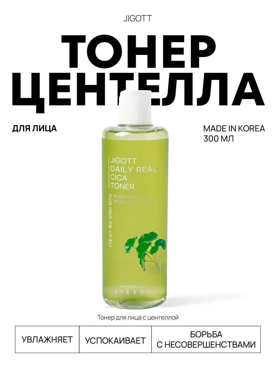 Корейский тонер с центеллой для лица Jigott Daily Real Cica Toner, 300 мл – идеальное средство для достижения здоровой и сияющей кожи. Этот продукт в основе имеет высококачественную центеллу азиатскую, которая является одним из самых популярных и эффективных ингредиентов в азиатской косметике.