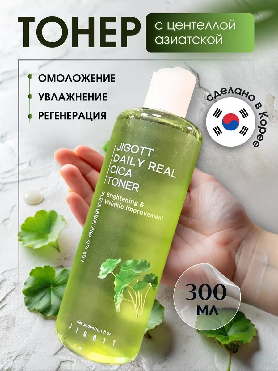 Корейский тонер с центеллой для лица Jigott Daily Real Cica Toner, 300 мл – идеальное средство для достижения здоровой и сияющей кожи. Этот продукт в основе имеет высококачественную центеллу азиатскую, которая является одним из самых популярных и эффективных ингредиентов в азиатской косметике. Успокаивающий тонер обладает противовоспалительными свойствами, способствует заживлению ран и улучшает эластичность, восстанавливает кожный покров. Экстракт центеллы азиатской эффективно успокаивает раздраженную кожу, уменьшает покраснение, вызванные акне или другими воспалительными процессами, предотвращает появление рубцов и шрамов, помогает быстрее проходить постакне. Тоник корея увлажняет кожу, устраняет стянутость и шелушения, освежает кожу, придает ей отдохнувший вид, делая ее более гладкой и мягкой. Он также помогает сократить видимость пор и улучшить общий тон и текстуру кожи, избавляет от прыщей и угрей, уменьшает жирность кожи. Экстракт ромашки в составе также обладает успокаивающими и ранозаживляющими свойствами. Регулярное использование этого тонера поможет достичь более яркого, увлажненного и здорового вида кожи. Для использования этого тонера достаточно нанести небольшое количество на ватный диск и нежно протереть лицо после очищения кожи. Важно не смывать продукт, а дать ему полностью впитаться. Затем можно продолжить регулярный уход за кожей, нанося ежедневный увлажняющий крем или солнцезащитный крем. Тонер с центеллой для лица – это отличное дополнение к вашему уходу, подходит всем типам кожи, особенно если у вас проблемная или чувствительная кожа. Он поможет успокоить раздражения, увлажнить кожу и улучшить ее общий внешний вид. Необходимый продукт для всех, кто стремится к красивой и здоровой коже.