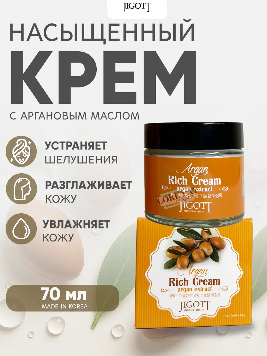 Увлажняющий крем для лица Jigott Argan Oil Rich Cream с аргановым маслом глубоко проникает в слои эпидермиса, снижает воспаление, обеспечивает глубокое питание. Уходовая косметика не только успокаивает, но и эффективно восстанавливает и защищает раздраженную кожу. Дневной крем сделает дерму гладкой, красивой и сияющей. Аргана обладает успокаивающим эффектом, к тому же, уменьшает проявления морщин у мужчин и женщин. Уход за лицом от корейского бренда является полезным источником витамина Е. Средство быстро избавит вас от пигментации, покраснений, пятен, устранит следы постакне, так как обладает осветляющим эффектом.