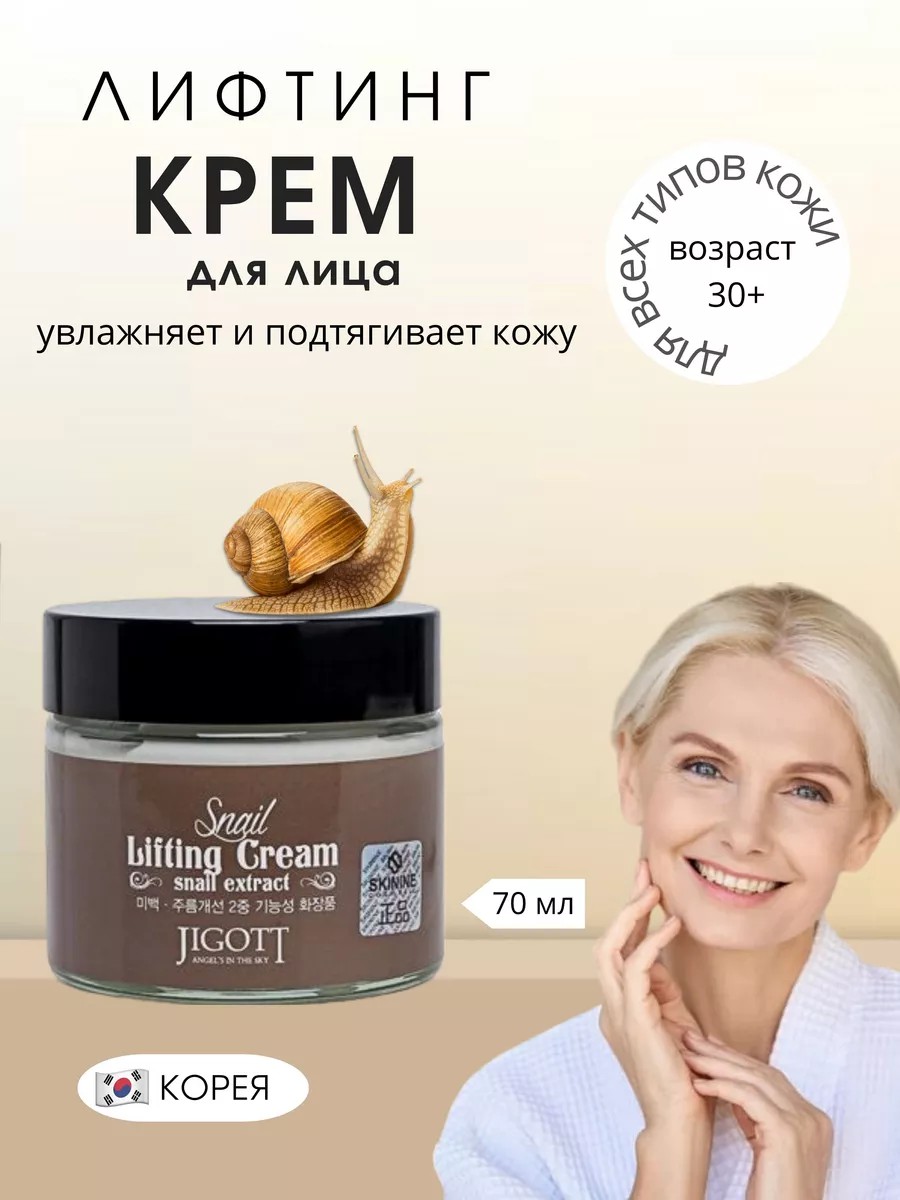 Крем для лица С МУЦИНОМ Snail Lifting с улиточной слизью – подтягивает, корректирует овал лица, устраняет дряблость, восстанавливает.Этот косметический продукт не просто увлажняет вашу кожу, но и обеспечивает комплексный уход, благодаря содержанию муцина улитки и коллагена. Это подтягивающий крем для ухода за лицом. Созданный для эффективного омолаживания и питания. В его основе лежит уникальный компонент – муцин улитки. Его высокое содержание делает крем идеальным для стимулирования регенерации. Уменьшении мимических морщин и восстановления упругости. Обогащен аденозином и ниацинамидом которые успешно борются против пигментных пятен. Обладают осветляющими и отбеливающими свойствами, выравнивает тон. Аллантоин в составе обеспечивает глубокое увлажнение и уменьшает раздражения. Благодаря такому сочетанию ингредиентов показывает отличные антивозрастные результаты и заметный лифтинг эффект. Подходит для всех типов кожи включая жирную и сухую. Особенно рекомендуется для комбинированной и чувствительной. Можно также использовать под макияж. Это хороший выбор для тех, кто стремится восстановить молодость и сияние. Способ применения: нанесите небольшое количество корейского крема на чистую поверхность утром или в ночное время. Аккуратно распределите похлопывающими движениями до полного впитывания. Jigott Snail Lifting Cream произведен в Корее - признанном лидере в косметической индустрии.у