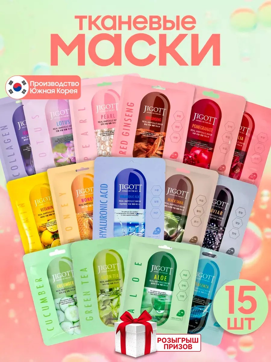 Набор увлажняющих масок для лица включает 15 разных масочек тканевых JIGOTT. Маски не повторяются!