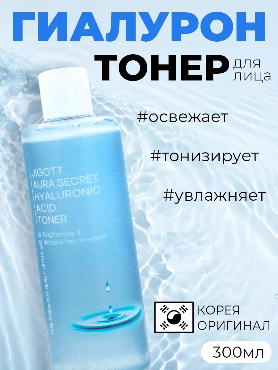 Увлажняющий тонер с гиалуроновой кислотой Jigott Aura Secret Hyaluronic Acid Toner - настоящая находка для обезвоженной кожи. Он глубоко гидрирует кожу, устраняет сухость и шелушения, моментально избавляет от стянутости. Тонер разглаживает рельеф, делает кожу упругой и свежей. Гиалуроновая кислота нескольких видов проникает в более глубокие слои кожи, насыщает их влагой, надолго сохраняет ее внутри, она противостоит испарению влаги, борется с обезвоженностью. Ниацинамид поддерживает в норме водно-жировой баланс, оставляет кожу увлажненной. Он восстанавливает ее, заботится о сохранности кожного барьера, повышает защитные функции кожи. Растительные экстракты регулируют работу сальных желез, заживляют кожу, оказывают антиоксидантное действие.