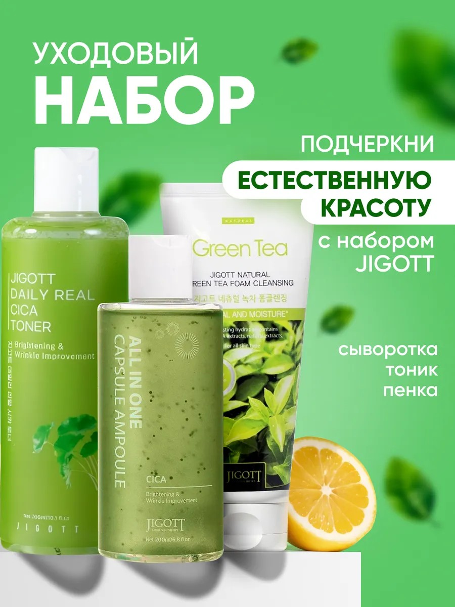 This Jigott set features an incredible combination of toner, Centella serum, and Green Tea foam.