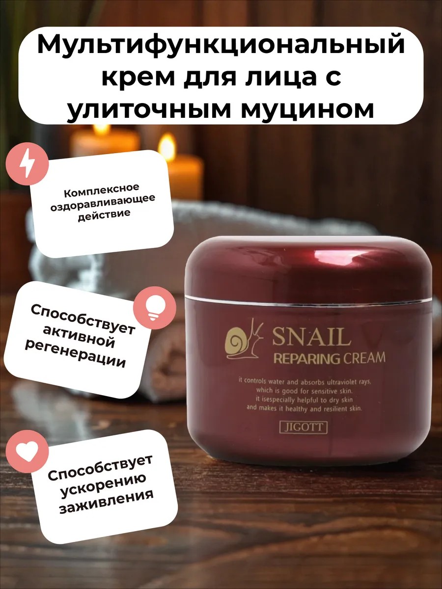 Многофункциональный крем с улиточным муцином JIGOTT Snail Reparing Cream эффективно восстанавливает как сухую увядающую, так и подростковую проблемную кожу.