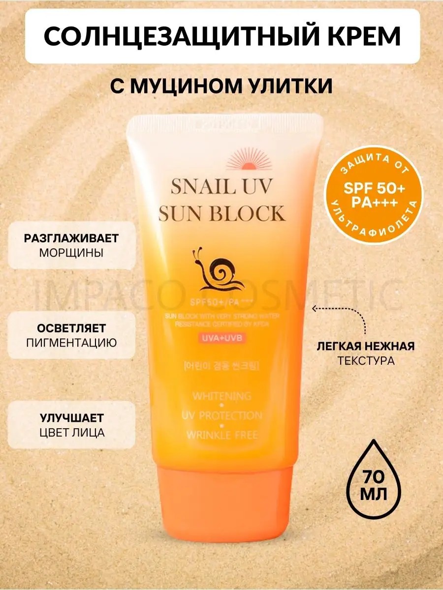 Snail UV Sun Block Cream SPF50 PA+++ is a moisturizing cream with a delicate, lightweight texture that not only effectively protects skin from the harmful effects of UV rays but also provides excellent skin care, helping to smooth wrinkles and lighten pigmentation, improving complexion. Snail mucin effectively accelerates regeneration and healing, normalizes sebaceous gland function and stimulates pore tightening, smoothes skin's microrelief, helps lighten pigmentation and post-acne marks, helps replenish moisture, and addresses the main cause of aging. This moisture-resistant formula forms a thin protective film against the aggressive effects of UVA and UVB rays, absorbs quickly, leaves a non-sticky feeling, and serves as an excellent makeup base. Directions: Cleanse your skin with a cleanser (foam or gel), apply your daily skincare cream, and finally, massage in sunscreen 30 minutes before sun exposure. Avoid contact with eyes. IMPORTANT: To ensure the sunscreen fully protects your skin, reapply every 2 hours on particularly sunny days. This is especially important for those with fair skin. Reapply the cream after touching a towel after swimming. Can be used as a makeup base.