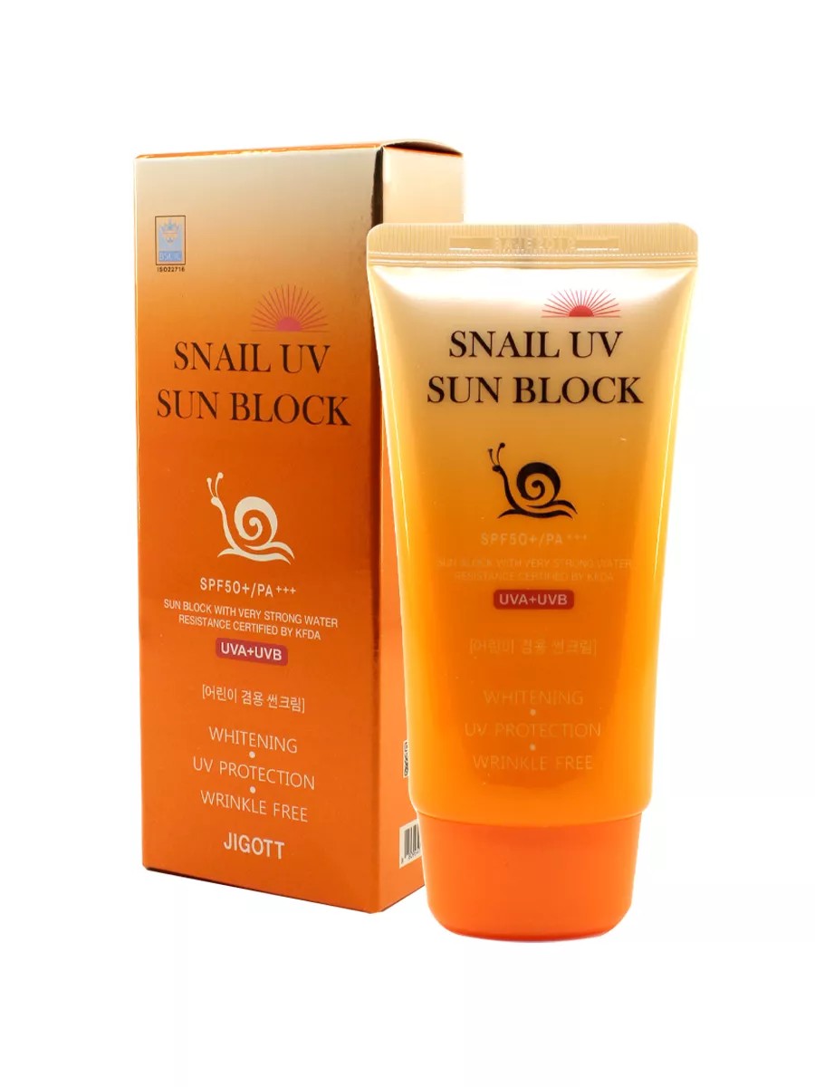 Jigott Snail UV Sun Block Cream SPF50+ PA+++, a sunscreen with snail mucin, has a delicate, lightweight texture. It not only effectively protects skin from the harmful effects of UV rays, but also provides excellent skin care, helping to smooth wrinkles and lighten pigmentation, improving complexion. Snail mucin effectively accelerates regeneration and healing, normalizes sebaceous gland function, stimulates pore tightening, smoothes skin's microrelief, helps lighten pigmentation and post-acne marks, helps replenish moisture, and addresses the main cause of aging. This moisture-resistant formula forms a thin protective film against the aggressive effects of UVA and UVB rays. It absorbs quickly, leaves a non-sticky feeling, and serves as an excellent makeup base. Apply the appropriate amount of cream to skin exposed to UV rays at the last step of your skincare routine.