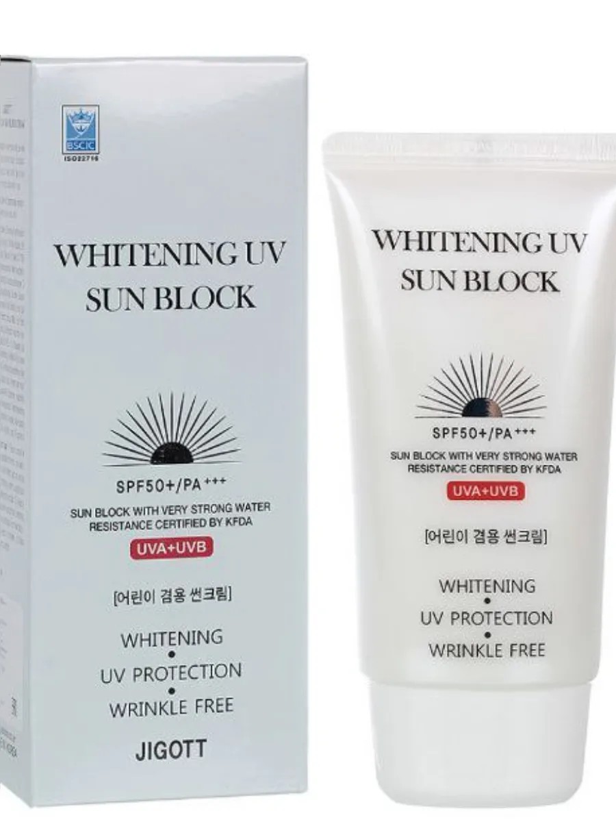 Корейский увлажняющий солнцезащитный крем JIGOTT Отбеливающий для лица и тела с SPF 50 и с УФ фильтром. Это надежная защита от солнца. Он предохраняет кожу от пересыхания, восстанавливает после солнечных ожогов и защищает от фотостарения. Успокаивающий крем от загара отлично увлажняет. Его можно использовать как дополнительное увлажнение и базу под макияж. Имеет осветляющий и отбеливающий эффект. Предотвращает появление пигментных пятен и борется с пигментацией. Заметное отбеливание и осветление спустя нескольких применений. Экстракт алое оказывает увлажняющее и питательное свойство, устраняет выработку подкожного жира. Защищает кожу от мелких морщин и действует против раннего старения как антивозрастной. Подходит как для сухой и чувствительной, так и для жирной, комбинированной и проблемной кожи. Профессиональное защитное средство Корея успокоит кожу после загара и восстановит баланс воды. Отличный солнцезащитный крем с спф 50 является освежающим, имеет витамины в своём составе и натуральные масла. Используйте для лица, шеи, зоны декольте и тела. Полный корейский уход за лицом смотрите на слайдах. Уходовая косметика для красоты и здоровья женщин.