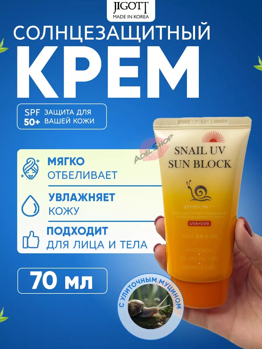 Jigott солнцезащитный крем для лица и тела Snail sun block SPF50+, 70 ml , надежно защищает от ультрафиолета, способствует увлажнению кожи, осветлению пигментации. Крем защищает кожу от пагубного воздействия UF-лучей, превосходно ухаживает за ней, защита от солнца с spf 50 РА+++ замедляет процесс старения и осветлению пигментации, улучшая цвет лица. Помогает коже восполнить недостаток влаги и исключает главную причину увядания. Крем от загара на основе влагостойкой формулы образует тонкую защитную пленку от агрессивного воздействия UVA и UVB лучей. Корейский крем от солнца и от загара с улиточным муцином для лица быстро впитывается, не оставляет ощущения липкости. Солнцезащитное средство прекрасно защитит вас от солнца.