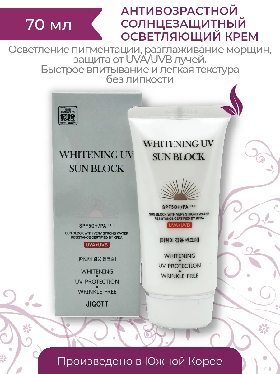 Увлажняющий солнцезащитный крем JIGOTT Whitening UV Sun Block Cream не только эффективно защищает кожу от пагубного воздействия UV-лучей, но и превосходно ухаживает за ней, способствует разглаживанию морщин и осветлению пигментации, улучшая цвет лица.