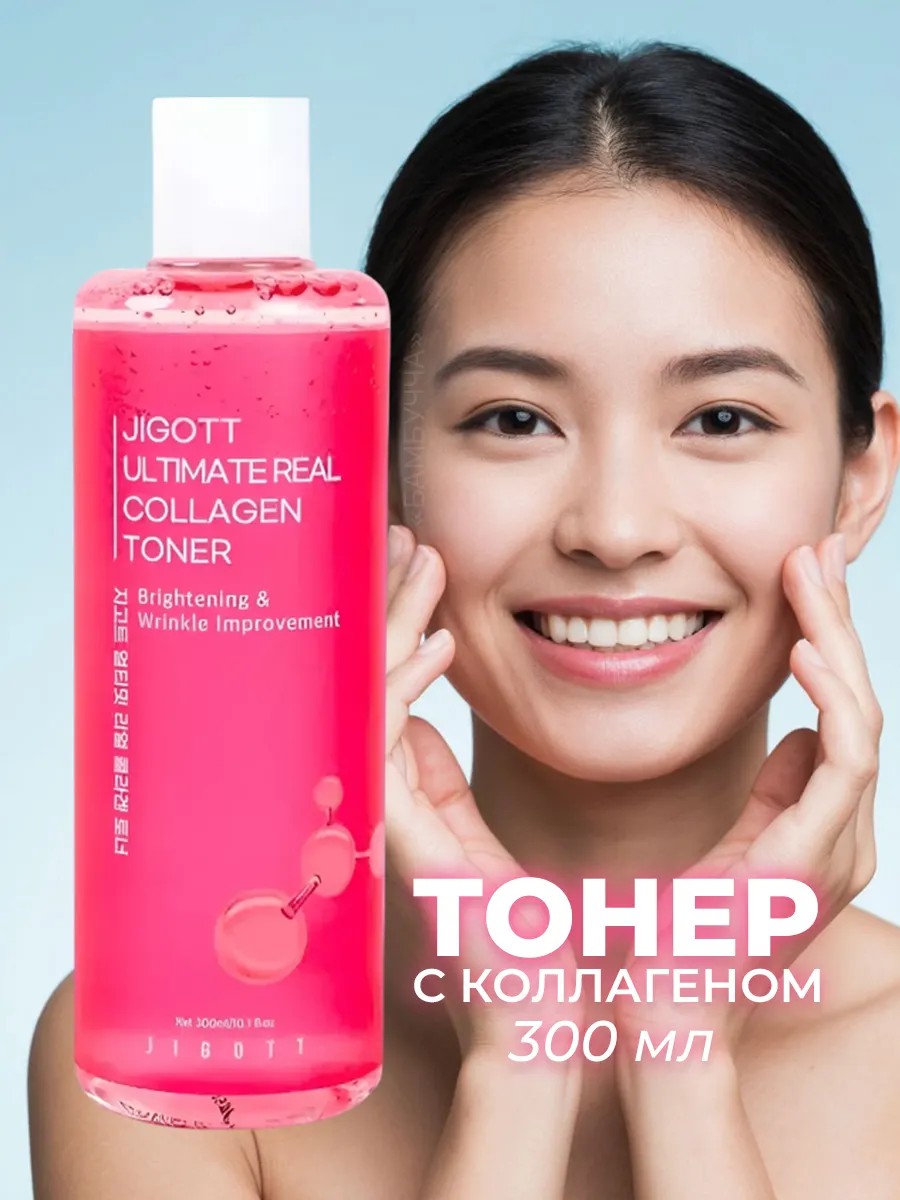 Jigott Ultimate Real Collagen Toner. The collagen in this toner moisturizes and retains moisture, providing elasticity and protecting the skin from external damaging factors. It helps improve skin tone, effectively protects skin cells from the damaging effects of free radicals, and slows the aging process.