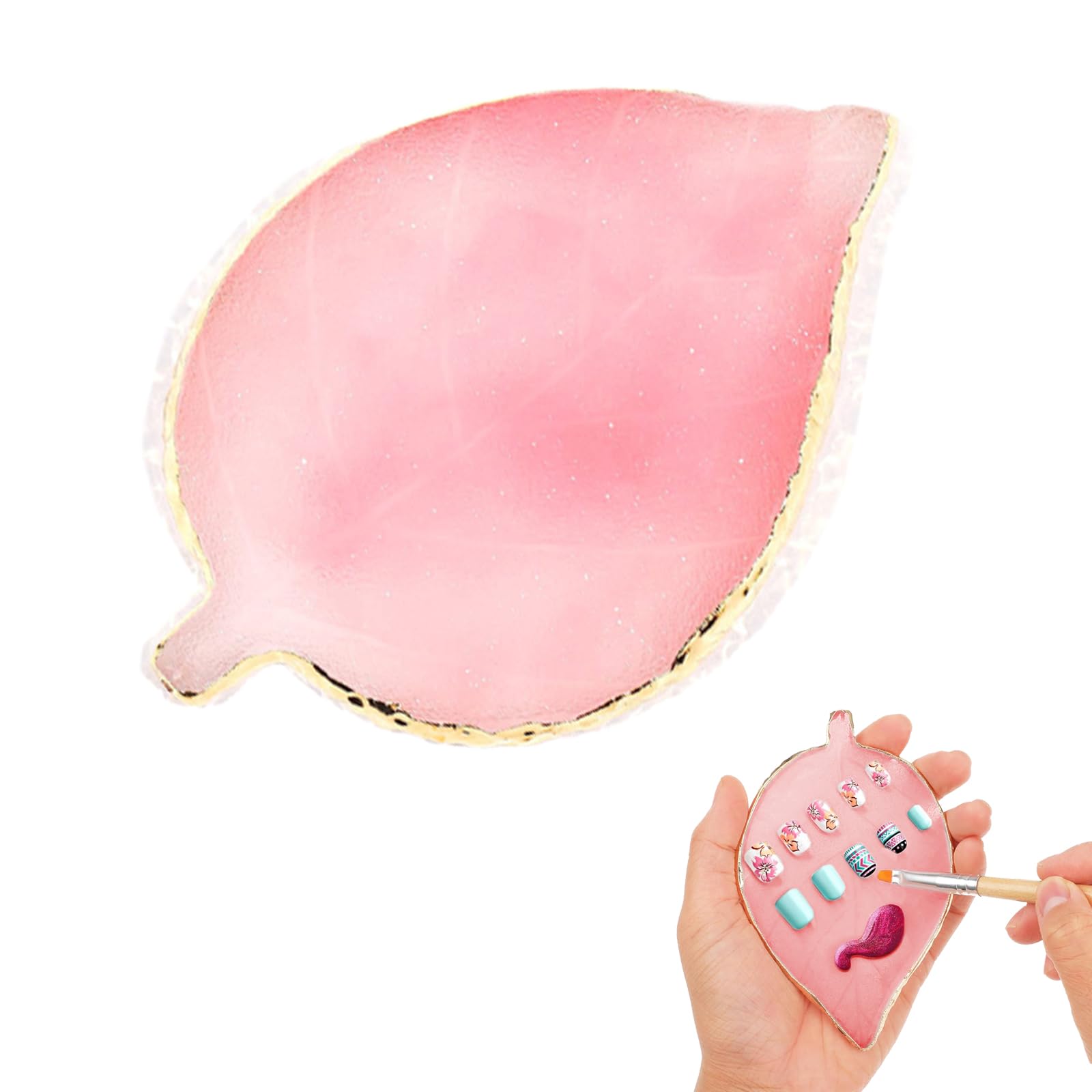 Our nail mixing palette made of high-quality synthetic resin offers a smooth, easy-to-clean surface and safe use. With generous dimensions, it is perfect for nail polish, gel, foundation and more. The elegant design with gold edges makes it the ideal gift for beauty fansFor every beauty fan: as a gift for your best friend, mother or for yourself – this nail palette is the ideal tool for anyone who wants to take their nail art to the next level. Elegant design: the glossy front and matte back in gemstone style, combined with gold edges, give the palette a modern and elegant touch. A real eye-catcher. Versatile use: perfect for mixing nail polish or gels, as well as foundation, lipstick, eye shadow and pigments. A real multi-talent for make-up enthusiasts. Optimal size: this palette is generously sized and offers enough space to mix multiple colors or pigments. Ideal for creative nail design or as a decorative accessory for photos. PREMIUM QUALITY: Our nail mixing palettes are made of high-quality synthetic resin, which provides a particularly soft surface. The smooth edges ensure safe use and are super easy to clean.Jimkply 1 stuk hars nagelkunst-palet met goudkleurige rand, nagelkunstpalet, multifunctioneel mengpalet voor manicure, make-up en nageldesign (roze bladeren) Bladeren Roze Ons nagelmengpalet van hoogwaardige synthetische hars biedt een glad, gemakkelijk te reinigen oppervlak en veilig gebruik. Met royale afmetingen is hij perfect geschikt voor nagellak, gel, foundation en meer. Het elegante design met gouden randen maakt het tot het ideale cadeau voor beauty-fansVoor elke beauty-fan: als cadeau voor je beste vriendin, moeder of voor jezelf – dit nagelpalet is het ideale hulpmiddel voor iedereen die zijn nagelkunst naar een hoger niveau wil tillen. Elegant design: de glanzende voorkant en matte achterkant in edelsteen-stijl, gecombineerd met gouden randen, geven het palet een moderne en elegante touch. Een echte blikvanger. Veelzijdig te gebruiken: perfect voor het mengen van nagellak of gels, maar ook voor foundation, lippenstift, oogschaduw en pigmenten. Een echt multitalent voor make-upliefhebbers. Optimale grootte: dit palet is royaal gedimensioneerd en biedt voldoende ruimte om meerdere kleuren of pigmenten te mengen. Ideaal voor creatief nageldesign of als decoratief accessoire voor foto's. Premium kwaliteit: onze nagelmengpaletten zijn gemaakt van hoogwaardig synthetisch hars, dat een bijzonder zacht oppervlak biedt. De gladde randen zorgen voor een veilig gebruik en zijn super eenvoudig te reinigen.