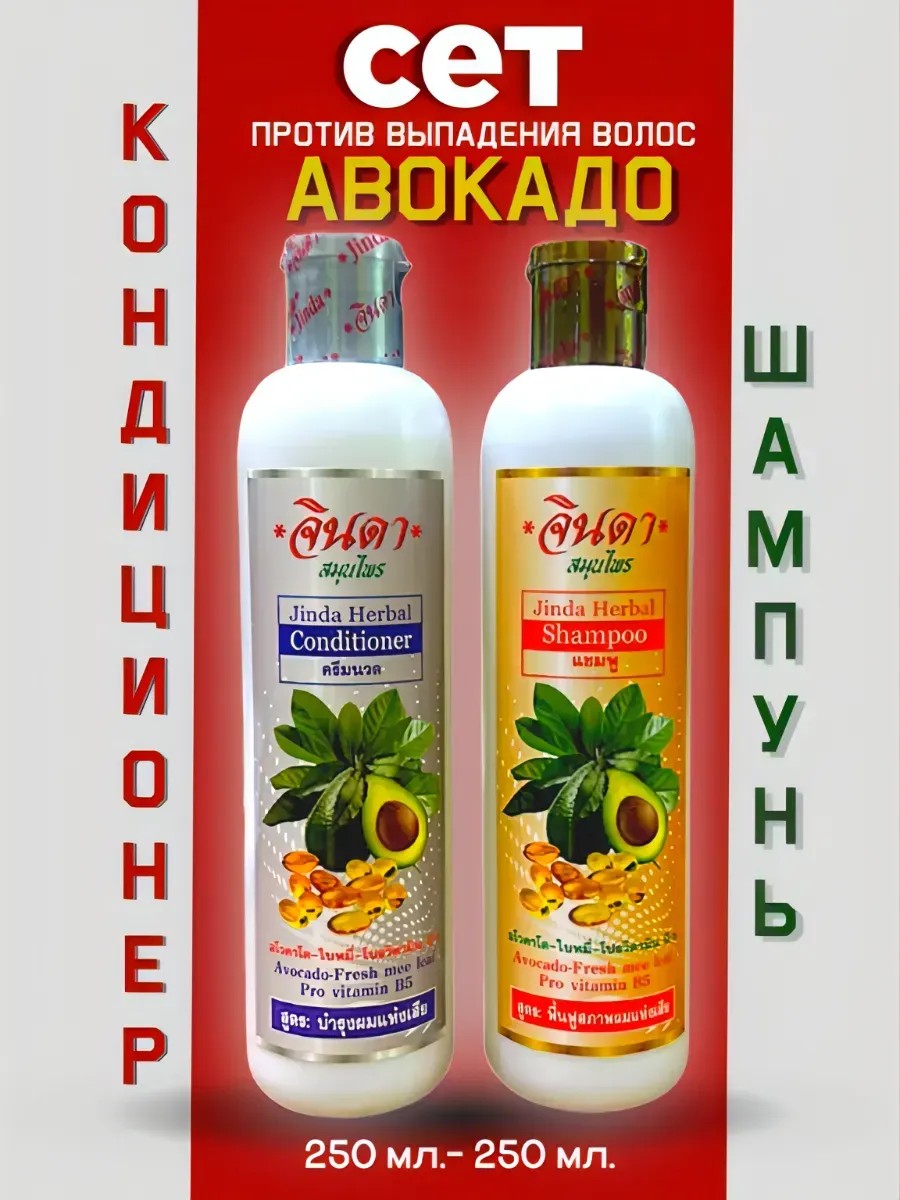 Сет травяной шампунь и кондиционер против выпадения волос и для укрепления с авокадо от Jinda — идеальное комплексное решение для тех, кто мечтает о густых, здоровых и сильных волосах.