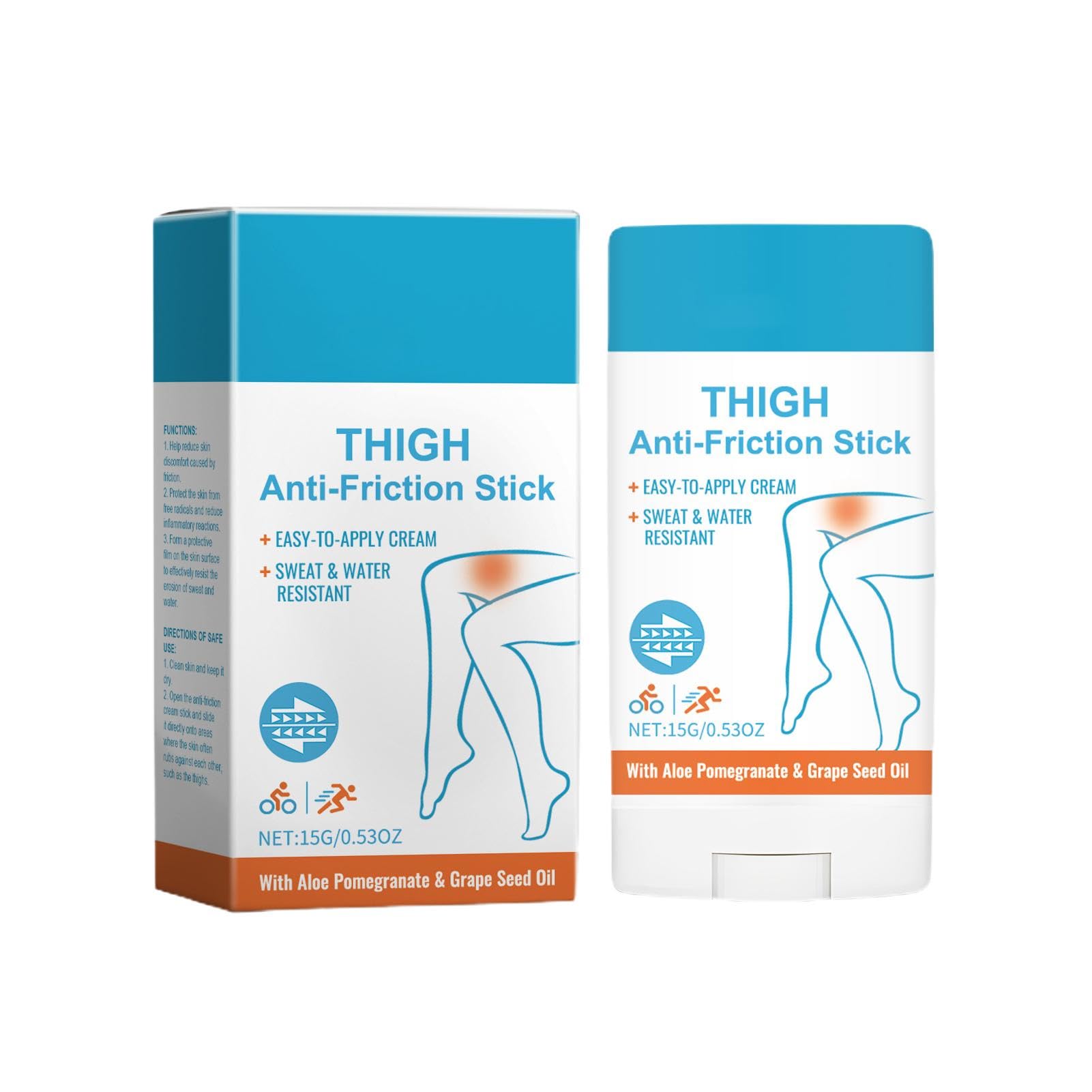 Anti-friction balm: Our anti-friction thigh cream, with gentle and natural ingredients, prevents chafing and is suitable for all skin types. Enjoy all-day comfort. Widely used: Ideal for fitness, leisure, business trips, and travel. This anti-friction thigh cream works effectively in various situations and keeps your skin smooth. Compact and convenient: This low-friction, waterproof thigh balm is designed for outdoor use and offers space-saving comfort and easy, portable storage. Skin protection: Our anti-friction thigh cream reduces skin friction between the thighs and forms a protective layer. It prevents chafing pain and improves overall thigh comfort and mobility throughout the day. Nourishing skin: Keep your skin smooth and comfortable with our anti-friction thigh cream. Its deep-moisturizing properties prevent dryness and roughness and ensure long-lasting softness that lasts all day.