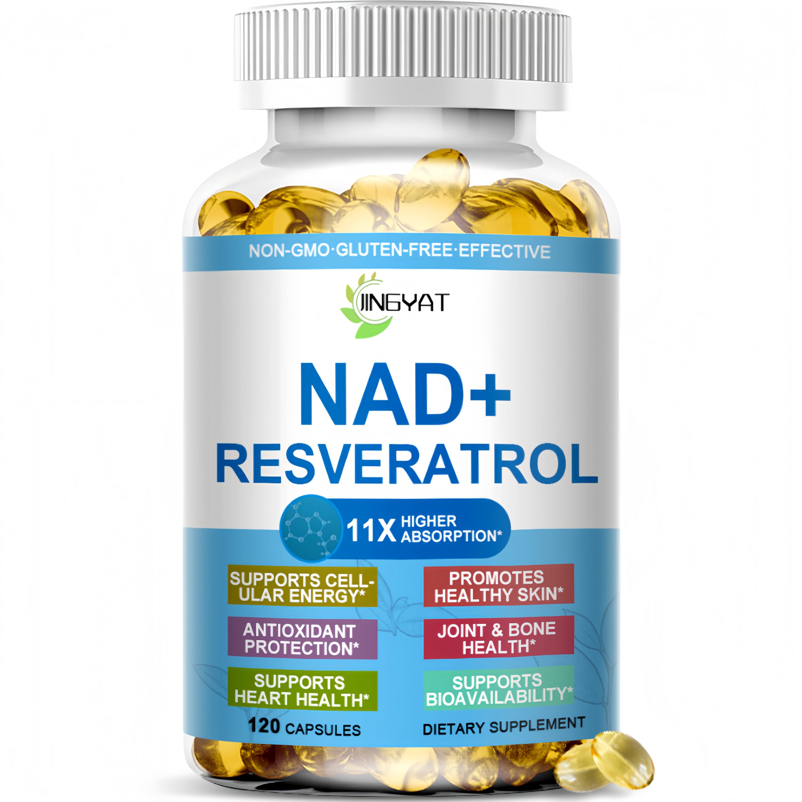 Clean, High-Quality Formula: We are committed to providing you with the highest quality NAD Supplement, carefully crafted from premium, non-GMO ingredients. Free from artificial fillers, preservatives, and synthetic additives, our NAD formula is designed to support your body's cellular energy, mental clarity, and overall vitality. Each softgel is designed to provide a convenient, precise dose of NAD, ensuring maximum absorption and effective support—naturally and without compromise. Manufactured in facilities that adhere to GMP standards, our formula guarantees purity and potency in every softgel, providing you with a clean, reliable, and powerful supplement for optimal health. Superior Absorption Convenience NAD Supplement: Experience enhanced bioavailability with our NAD softgels. Unlike traditional NAD Supplement capsules, which can be slower to dissolve and harder to swallow, our nad softgels are rapidly absorbed by the body, ensuring a consistent, precise dose every time. No more struggling with hard pills—just swallow and go! The softgel form ensures optimal absorption, providing support for cellular energy, mental clarity, and overall wellness. Enjoy a clean, convenient, and effective solution for your NAD supplementation without the hassle of bulky capsules. Cellular Energy Vitality Support: Boost energy, mental clarity, and overall wellness with our advanced NAD Supplement softgels. As NAD levels naturally decline with age, supporting healthy NAD levels can help maintain cellular function and vitality. Our NAD softgels are highly bioavailable, digestible, and rapidly absorbed, providing essential support for energy and overall well-being. Convenient, mess-free, and precise—just take one softgel daily to support your body's natural vitality. . 11-in-1 Advanced NAD Supplement Complex: Our 11-in-1 NAD Supplement combines NAD, Resveratrol, CoQ10, Hyaluronic Acid, Hydrolyzed Collagen, and antioxidants like Quercetin and Turmeric to support cellular energy. Enhanced with Grape Seed Extract, this blend promotes antioxidant protection, while Black Pepper Extract improves absorption for maximum effectiveness. Nad Resveratrol Supplement: NAD is a coenzyme found in every cell of the body, playing a key role in cellular energy production and mitochondrial function. As NAD levels naturally decline with age, our NAD Supplement with Resveratrol are designed to help support cellular health and maintain overall vitality. These easy-to-take nad softgels provide a convenient way to promote energy and wellness. Non-GMO and free from artificial additives, our formula helps you maintain your well-being. .