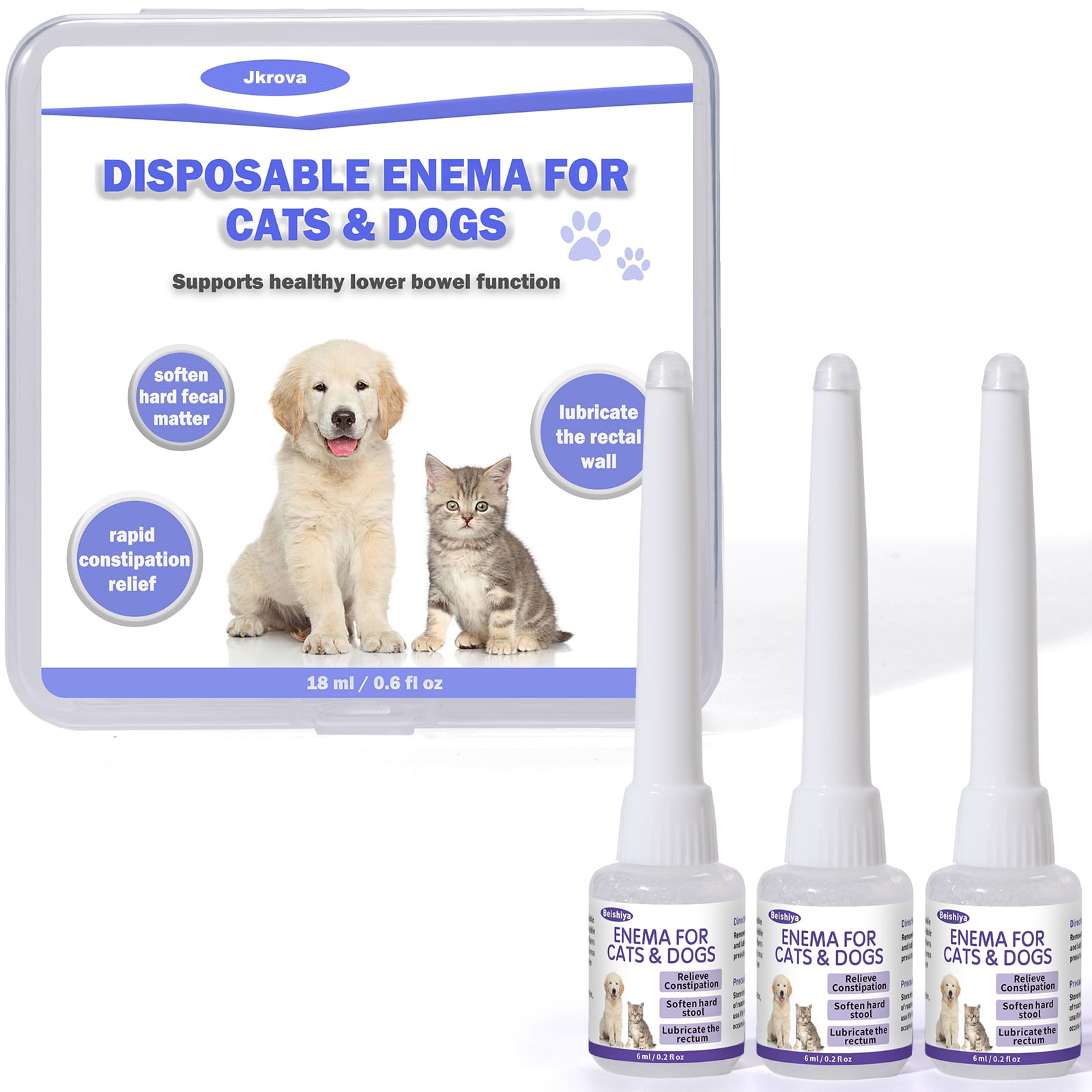 Is your pet struggling with constipation, scooting, or painful bowel movements? Our vet-recommended pet enema offers fast, safe relief. Pet Enema stimulates the intestines, softens hardened stool, and eases discomfort—helping your pet feel comfortable and healthy again. HOW TO USE AT HOME: Prepare Your Pet: Place on a towel and gently restrain. Administer: Lift the tail, insert nozzle 2–3 inches, and slowly release (1 mL every 3 seconds). Repeat after 1 hour if needed. Massage Gently: Rub the abdomen to help stool pass (usually within 10 minutes, sometimes up to 2 hours). Monitor: Small blood streaks are normal. If dehydration occurs, fluids may be required. Note: If a second enema does not work, consult your veterinarian.Easy At-Home Care: Remove the single-use cap, gently insert the nozzle, and press slowly. (Optional: add lubricant for comfort.) Quick, affordable relief at home—avoid costly vet visits. For All Pets: Suitable for dogs, cats, and small animals of any age or breed. Promotes softer stools, easier elimination, and fast relief—an essential in every pet's first aid kit. Safe Pain-Free: With a smooth, rounded nozzle, it prevents injury and minimizes discomfort. The gentle solution lubricates the intestines without causing diarrhea—ideal for recovery, chronic issues, or occasional constipation. Gentle Effective: When diet changes or laxatives fail, this enema provides safe, targeted relief. It clears blockages, eases bloating and pain, and helps pets regain energy and playfulness. Fast Relief: Is your pet constipated? Our vet-formulated enema quickly softens stool, lubricates the rectum, and stimulates natural bowel movements—restoring comfort without straining or scooting.
