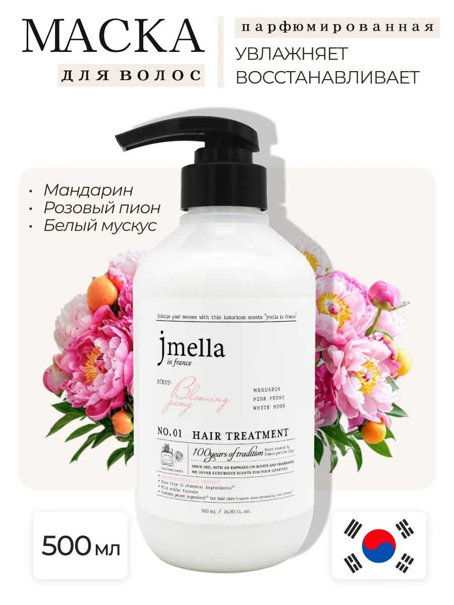 Маска-кондиционер для волос "Цветущий пион" N0.01 In France Bloaming Peony с экстрактом мандарина, розового пиона и белого мускуса от молодого корейского бренда уходовой косметики для женщин Jmella - это отличное средство, направленное на увлажнение и восстановление ваших волос. Корейская маска обладает мощным увлажняющим комплексом, который способствует удержанию влаги внутри волоса, восстанавливает структуру пересушенных и окрашенных волос, делает их послушными и мягкими. Большой комплекс активных компонентов, входящих в состав профессиональной маски для волос, наполняет волосяной стержень питательными веществами, за счет чего восстанавливается структура волоса по всей длине, разглаживаются чешуйки, облегчается расчесывание. Маска для восстановления волос укрепляет локоны, уменьшает ломкость волос, сокращает количество секущихся кончиков, повышает шелковистость. Увлажняющий бальзам - ополаскиватель для волос содержит целый набор аминокислот. Комплекс из 17 питательных компонентов создает защитную увлажняющую пленку, обволакивает поверхность волосяной нити, делая её более прочной и устойчивой. Они сглаживают кератиновые чешуйки и заполняют самые мелкие трещинки в структуре, обеспечивают блеск и термозащиту. Корейская маска Jmella подойдет для всех типов волос и кожи головы, в том числе для чувствительной, и может использоваться в качестве ежедневного ухода. Парфюмированная маска протестирована дерматологами, не содержит 12 распространённых химических ингредиентов и имеет легкий ненавязчивый аромат, который подчеркнет вашу индивидуальность. Способ применения: с помощью удобного дозатора небольшое количество маски нанесите на чистые влажные волосы, хорошенько распределите средство по всей длине, оставьте на 2-3 минуты, а после смойте теплой водой. Для лучшего эффекта рекомендуется использовать средство вместе с шампунем Jmella.
