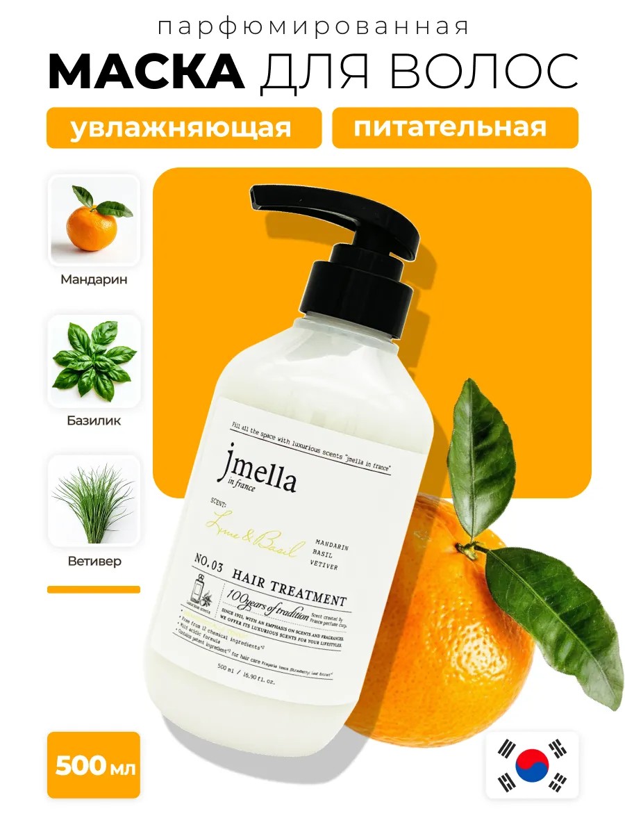 Парфюмированная маска-кондиционер для волос "Лайм и Базилик" с экстрактом мандарина, базилика и ветивера, Корея, N0.03 In France Lime & Basil Hair Treatment, 500 мл от молодого корейского бренда уходовой косметики Jmella - это отличное средство, направленное на осуществление комплексного ухода за волосами. Корейская маска для тонких и поврежденных волос обладает мощным увлажняющим комплексом, который способствует удержанию влаги внутри волоса, восстанавливает структуру пересушенных и окрашенных волос, делает их послушными и мягкими. Набор активных компонентов, входящих в состав профессиональной маски для волос, наполняет волосяной стержень питательными веществами, за счет чего восстанавливается структура волоса по всей длине, разглаживаются чешуйки, облегчается расчесывание. Маска для восстановления волос укрепляет локоны, уменьшает ломкость волос, сокращает количество секущихся кончиков. Увлажняющая маска-бальзам для волос содержит аминокислотный комплекс из 17 питательных компонентов, которые создают защитную увлажняющую пленку, обволакивают поверхность волосяной нити, делая её более прочной и устойчивой. Корейская маска Jmella подойдет для всех типов волос и кожи головы, в том числе для чувствительной, и может использоваться в качестве ежедневного ухода.