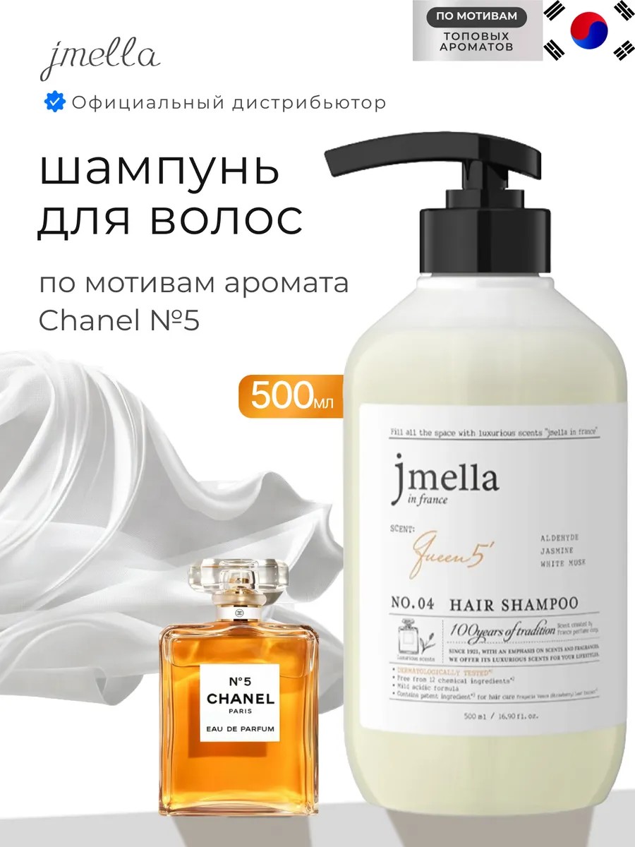 JMella In France Queen 5 Hair Shampoo (500 ml) for all hair types deeply moisturizes, smoothes cuticles, leaves strands silky and easy to comb. It features the iconic Chanel No. 5 scent that lingers all day. Birch sap extract strengthens and stimulates hair growth, while centella asiatica, edelweiss, and aloe vera thoroughly cleanse the scalp and normalize sebum production, instantly soothing and leaving a feeling of freshness. Thanks to strawberry extract and panthenol, the shampoo restores hair structure along the entire length, deeply moisturizes, smoothes cuticles, leaves hair silky and easy to comb.