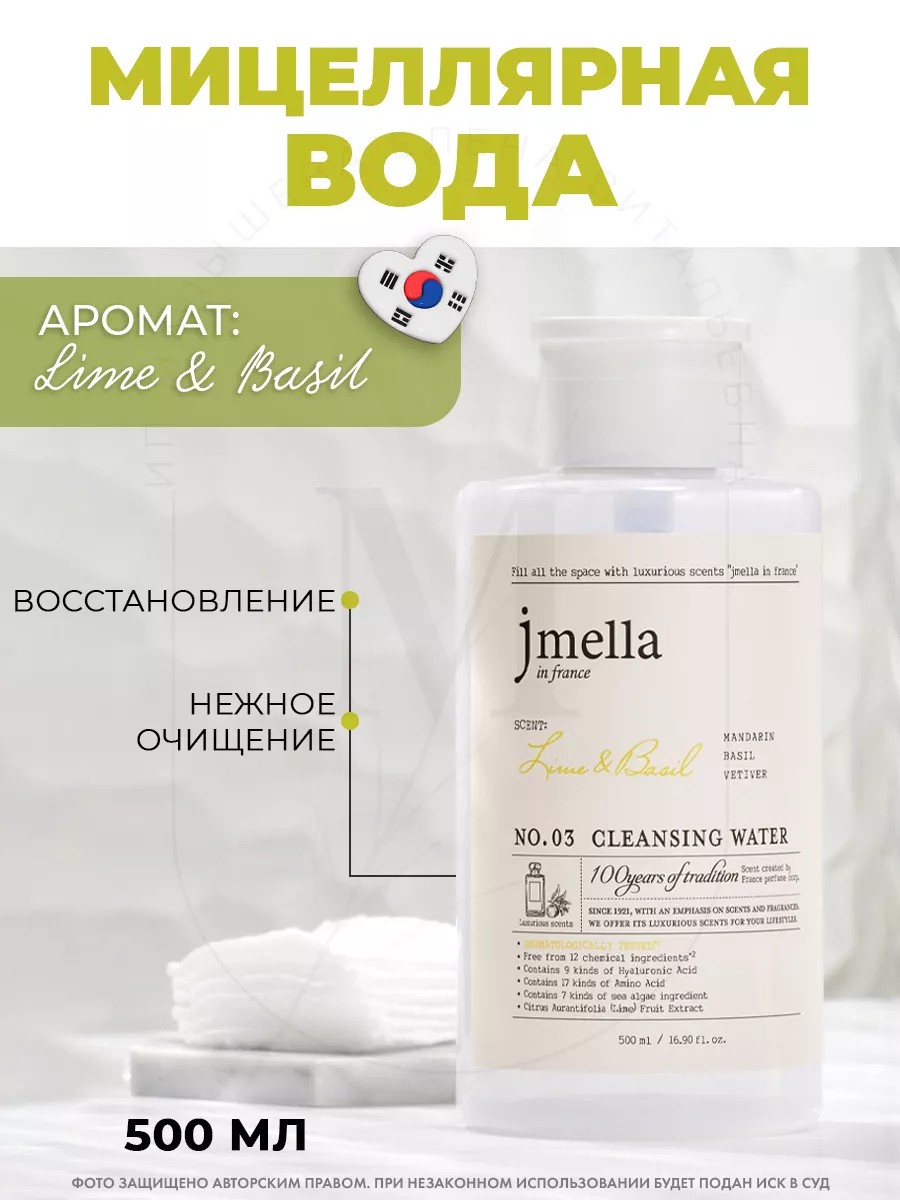 Мицеллярная вода JMELLA IN FRANCE LIME & BASIL CLEANSING WATER деликатно очищает. Очищающее средство, предназначенное для удаления декоративного косметического макияжа. Демакияж. Содержит множество мелких молекул, называемых мицеллами. Они способны смывать загрязнения, сохраняя увлажнение.