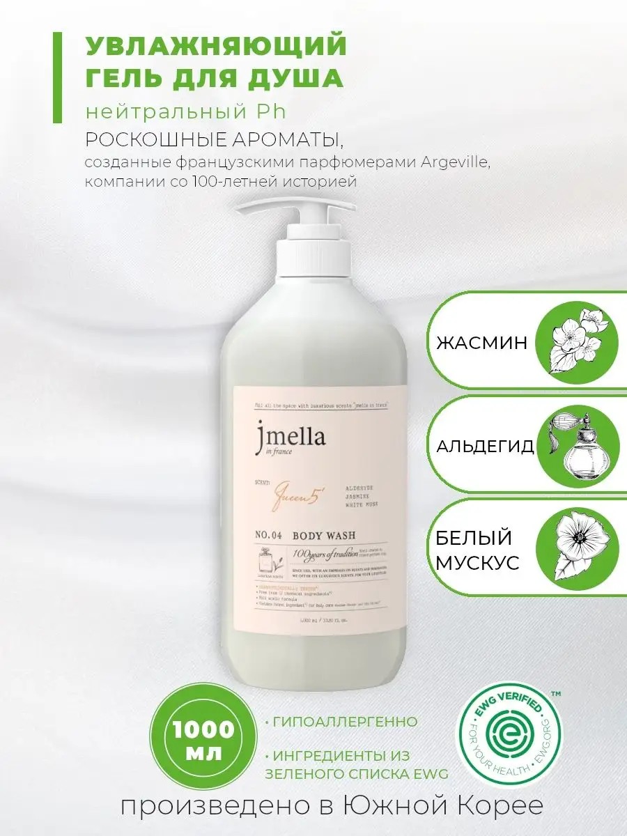 Гель для душа с ароматом Альдегида, жасмина и белого мускуса JMELLA in France Queen 5' Body Wash содержит 25 растительных экстрактов, которые обеспечивают не только очищение кожи, но и бережный уход за ней. Он дает густую обильную пену, удаляющую грязь, излишки подкожного жира, скопившегося в порах.
