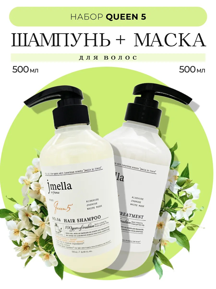 Package ContentsJmella Perfumed Hair Shampoo Queen 5N0.04 In France Queen 5 Hair Shampoo, 500 ml; Jmella Perfumed Hair Mask Queen 5N0.04 In France Queen 5 Hair Treatment, 500 ml