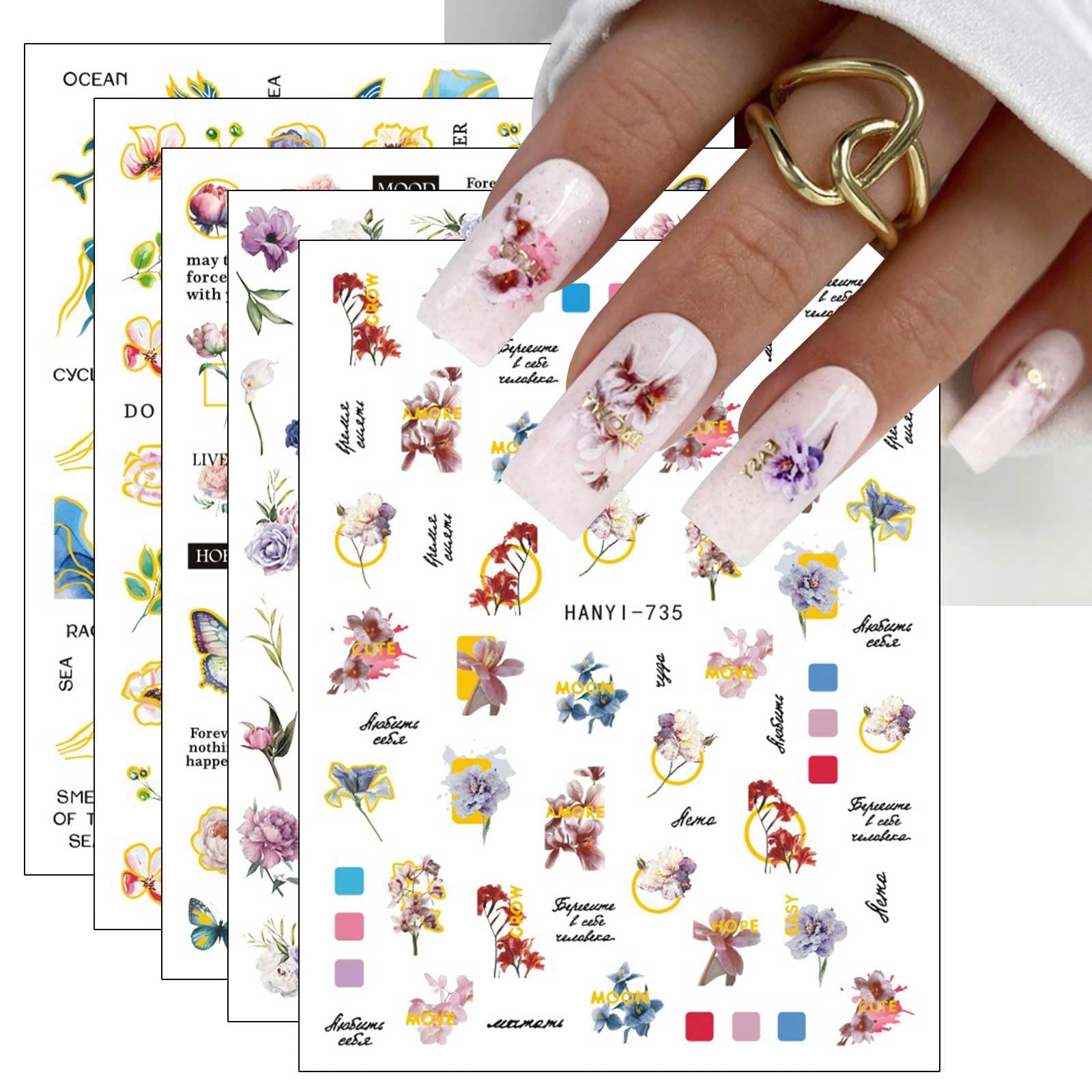 JMEOWIO 9 Sheets Flower Nail Art Stickers Decals Self-Adhesive Spring Floral Letter Nail Supplies Nail Art Design Decoration Accessories