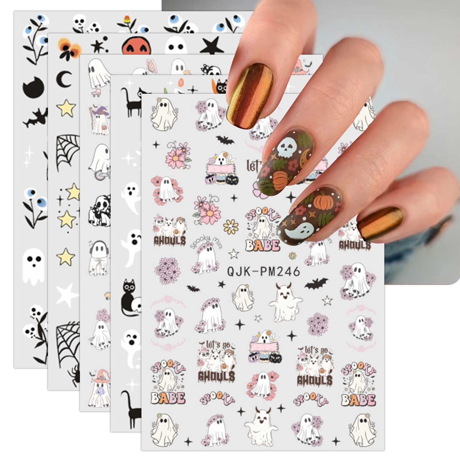 JMEOWIO 9 Sheets Halloween Nail Art Stickers Decals Self-Adhesive Cute Pink Flower Ghost Nail Supplies Nail Art Design Decoration Accessories