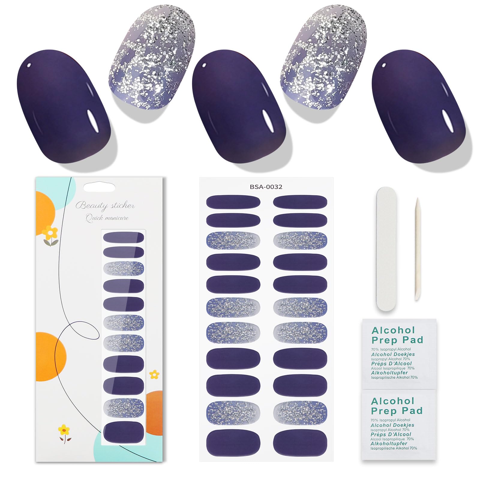 How to use: Step 1: Clean your nails.Wipe off oil, water and other moisture with the prep pads.Then let your nails dry naturally. Step 2: Select the right size and apply the strips to your nails.Leave a small distance between the strip and your cuticle. Step 3: Press the strips firmly on your nails and smooth them.Then cut off the excess.quality guarantee - If you have problems after buying nail art, please contact our customer service, which makes your purchase absolutely risk -free.And we wish you a pleasant shopping experience.Perfect gift: The best gift for her friends, her mother, her wife.Nail stickers are ideal for their fingernails, footnail decorations, home use and the nail salon.Fast application: Gel nail film stickers can be easily attached and filed.No UV lamp is required for baking.You can get nail art in salon quality in just a few minutes.Removing is also very simple: pull it off with a wooden stick or fingers.Gel-nail stickers of the new generation-made from gel material of the new generation, is not necessary UV lamp light and lasts up to 14 days, fits in all types of nail sizes and shapes.Light and pleasant to carry, durable, non -toxic, harmless, safe.The package contains: 22 gel nail strips, 2 cleaning towels, 1 wooden sticks, 1 nail file. „So verwenden Sie: Schritt 1: Reinigen Sie Ihre Nägel. Wischen Sie mit den Prep Pads Öl, Wasser und andere Feuchtigkeit ab. Lassen Sie Ihre Nägel anschließend auf natürliche Weise trocknen. Schritt 2: Wählen Sie die richtige Größe und tragen Sie die Streifen auf Ihre Nägel auf. Lassen Sie dabei einen kleinen Abstand zwischen dem Streifen und Ihrer Nagelhaut. Schritt 3: Drücken Sie die Streifen fest auf Ihre Nägel und glätten Sie sie. Schneiden Sie dann den Überschuss ab.Qualitätsgarantie - Wenn Sie nach dem Kauf von Nail Art Stickern Probleme haben, wenden Sie sich bitte an unseren Kundendienst, der Ihren Kauf absolut risikofrei macht. Und wir wünschen Ihnen ein angenehmes Einkaufserlebnis. Perfektes Geschenk: Das beste Geschenk für Ihre Freundinnen, Ihre Mutter, Ihre Frau. Nagelaufkleber eignen sich hervorragend für Ihre Fingernägel, Fußnageldekorationen, den Heimgebrauch und das Nagelstudio. SCHNELLE ANWENDUNG: Gel-Nagelfolienaufkleber lassen sich einfach anbringen und abfeilen. Zum Backen ist keine UV-Lampe erforderlich. Sie können in nur wenigen Minuten Nagelkunst in Salonqualität erhalten. Auch das Entfernen ist ganz einfach: Ziehen Sie sie mit einem Holzstäbchen oder den Fingern ab. Gel-Nagelaufkleber der neuen Generation – Hergestellt aus Gelmaterial der neuen Generation, ist kein UV-Lampenlicht erforderlich und hält bis zu 14 Tage, passt auf alle Arten von Nagelgrößen und -formen. Leicht und angenehm zu tragen, langlebig, ungiftig, harmlos, sicher. Das Paket enthält: 22 Gel-Nagelstreifen, 2 Reinigungstücher, 1 Holzstäbchen, 1 Nagelfeile.JMEOWIO Nagelfolie Glitzer Dunkelblau Gel Nagelfolien Selbstklebend Nail Sticker Dekoration Nageldesign Zubehör