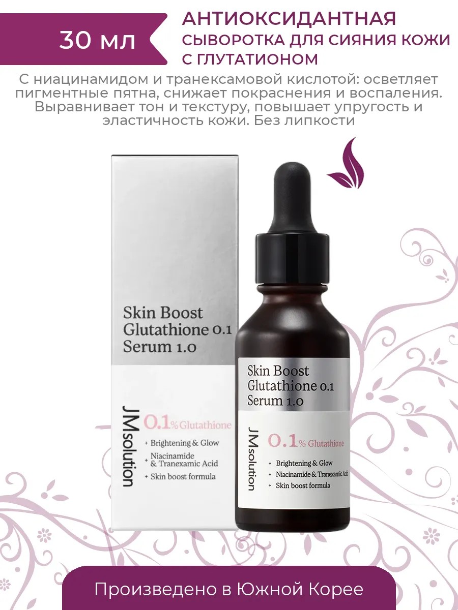 Антиоксидантная сыворотка для сияния кожи с глутатионом JMsolution Skin Boost Glutathione 0.1 Serum 1.0 эффективно осветляет кожу, снижает покраснения и воспаления. Прекрасно борется с пигментными пятнами, неровным тоном кожи, тусклостью и неровной текстурой. Благодаря антиоксидантным свойствам, она защищает кожу от окислительного воздействия, повышает ее упругость и эластичность.