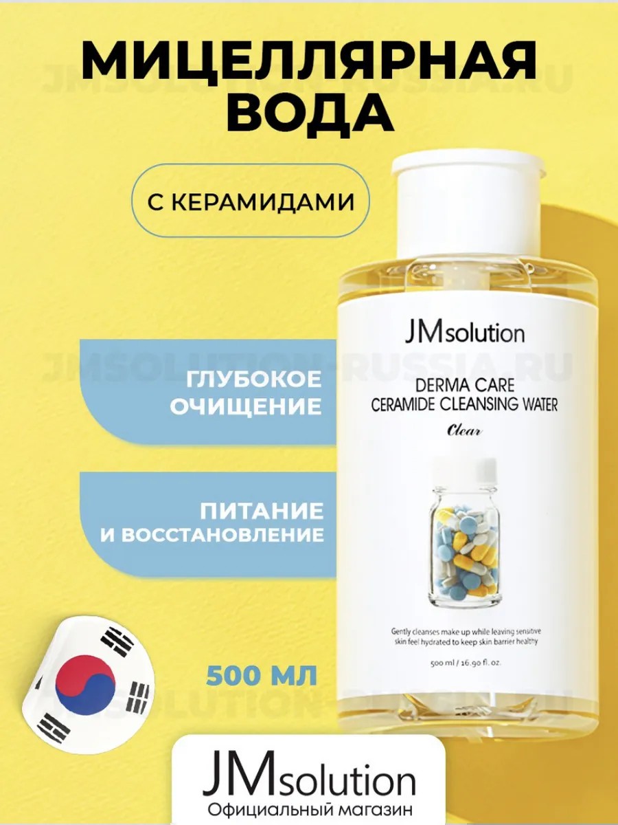 Мицеллярная вода с церамидами JM Solution Derma Care Ceramide Cleansing Water деликатно и эффективно очищает. Очищающее средство, предназначенное для удаления декоративного косметического макияжа. Керамидный тоник для ухода за лицом и демакияжа содержит множество мелких молекул, называемых мицеллами. Они способны смывать загрязнения, сохраняя увлажнение и здоровье.