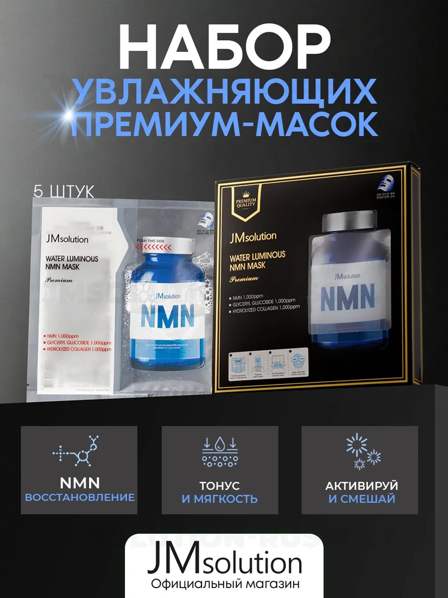 Jm Solution Water Luminous Nmn Mask Premium for intensive hydration and nourishment of the facial skin. The mask has a comfortable shape and fits perfectly to the contours of the face, providing full coverage and the best possible absorption of effective ingredients. It increases skin firmness and elasticity, and reduces the appearance of wrinkles and age-related changes. The mask also has a high concentration of hyaluronic acid, which deeply hydrates and retains moisture in the skin.