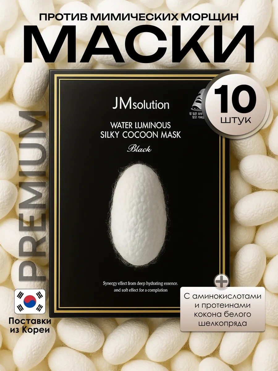 Маска для упругости кожи (набор 10 масок) JMsolution Water Luminous Silky Cocoon Mask Black с протеинами шёлка и экстрактом тутового шелкопряда. Маска интенсивно увлажняет и способствует удержанию влаги в клетках эпидермиса, повышает эластичность и упругость кожи, ускоряет выработку собственных коллагеновых волокон и укрепляет тургор кожного покрова. 3 вида гиалуроновой кислоты и пептиды омолаживают и замедляют процессы старения, уменьшают глубину морщин и препятствуют их появлению.