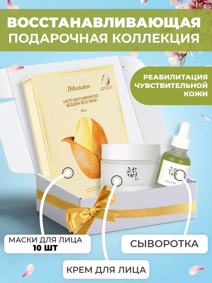 | Комплектация | Маски с пробиотиками и пептидами LACTO SACCHAROMYCES GOLDEN RICE MASK PLUS; Увлажняющий крем для лица с рисом и женьшенем Dynasty Cream; Beauty of Joseon Сыворотка Calming Serum: Green tea+Panthenol |