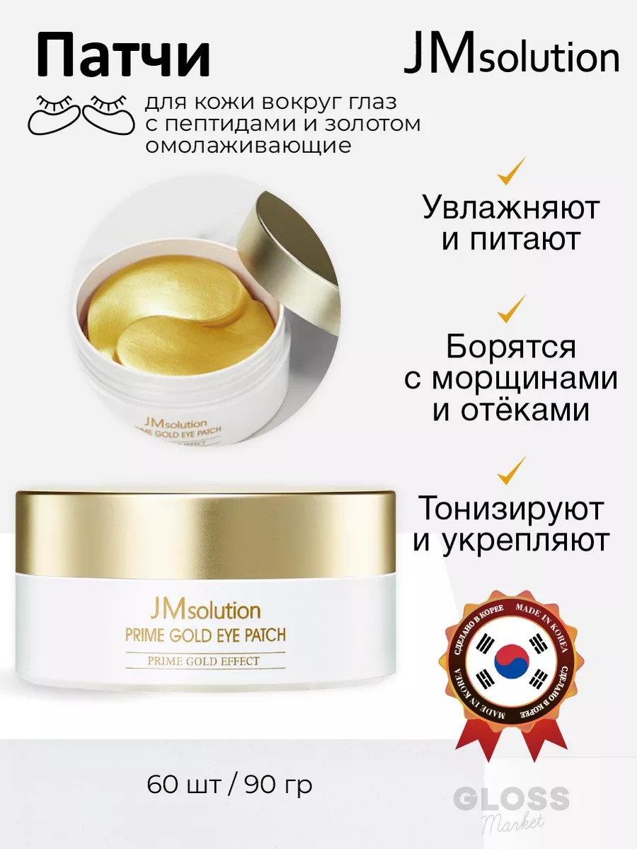 Освежающие гидрогелевые патчи с пептидами и золотомJMsolution Prime Gold Eye Patch мгновенно устраняют сухости и припухлости, освежают и увлажняют. Мягко осветляют и тонизируют, возвращают коже сияние и замедляют процессы старения. Средство интенсивно питает, повышает упругость и эластичность тканей, способствует разглаживанию морщинок. Мягко осветляет и снижает выраженность тёмных кругов.Стимулирует циркуляцию крови, придаёт глазам свежий и отдохнувший вид, снижает отёчность. Патчи можно использовать в качестве локальной маскив области под глазами, а также в зоне носогубных складок и межбровной морщины.