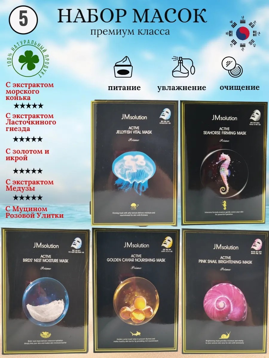 Набор из пяти тканевых масок популярного корейского бренда JMsolution позволит Вам обеспечить качественный уход за лицом. Все маски произведены в Южной Корее и являются оригинальной продукцией. Маски имеют все необходимые сопроводительные документы и сертификаты. В состав набора входят маски: