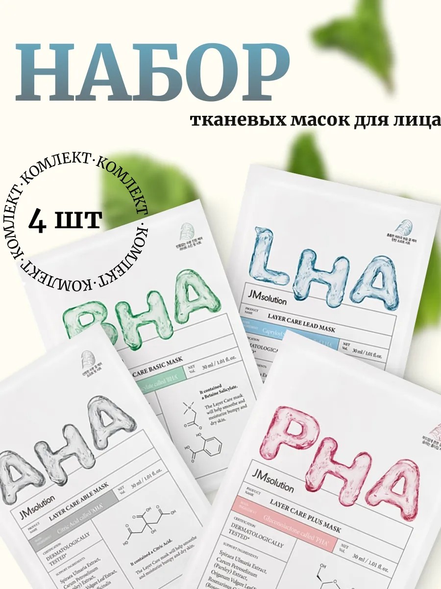 | Комплектация | JMsolution Комплект 4 шт Маски-салфетки с AHA BHA LHA PHA кислотой |