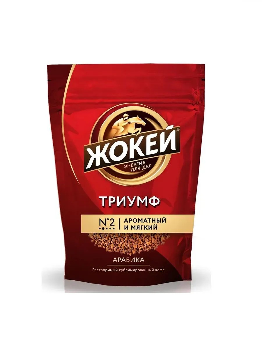 Жокей, кофе растворимый сублимированный Триумф, 150 г. Кофе растворимый сублимированный Жокей Триумф изготовлен из отборных зерен арабики. Напиток отличается мягким насыщенным вкусом и изысканным ароматом благодаря бережной обжарке и современной технологии получения кофейных кристаллов.