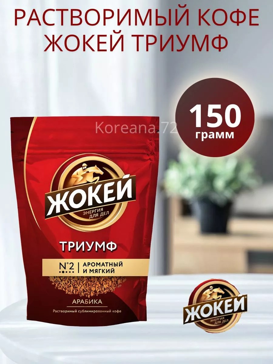 Сублимированный растворимый кофе Жокей Триумф с мягким вкусом и ярким ароматом. Кофейный бленд созданный изотборных сортов различных регионов.Жокей Триумф 150гр отличается мягким, хорошо сбалансированным вкусом и ярким ароматом. Сила вкуса 2/5 отборная арабика .