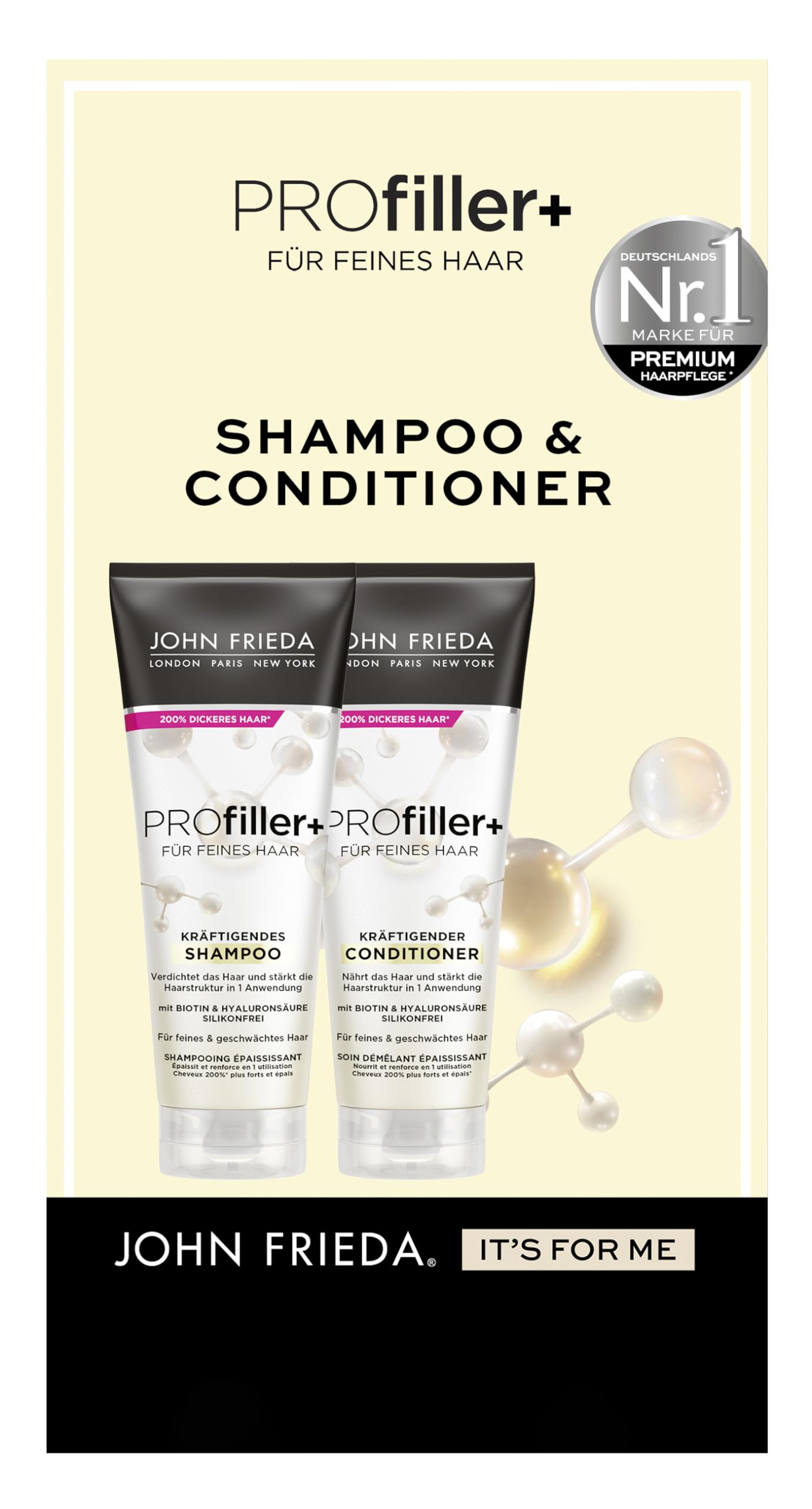 PROFILLER Series: Specially designed for fine, thin, and weakened hair, the shampoos and conditioners form the perfect base care for thickening and strengthening hair. The lightweight, heat-protecting ProFiller spray helps hair achieve a natural, flexible, and long-lasting hold, making styling easier. Profiller Shampoo for fine hair thickens hair and ensures stronger hair with more volume after just one application. INGREDIENTS Shampoo: Aqua, Cetearyl Alcohol, Isodecyl Neopentanoate, Tapioca Starch, Parfum, Helianthus Annuus Seed Oil, PVP, Polyquaternium-37, Behenamidopropyl Dimethylamine, Cetyl Esters, Behentrimonium Chloride, Benzyl Alcohol, Hydroxypropyl Methylcellulose, Dipropylene Glycol, Polyimide-1. Glycine, glycerin, alcohol, lecithin, panthenol, tetrasodium EDTA, caffeine, hyaluronic acid, tocopheryl acetate, biotin, benzoic acid, phenoxyethanol, hexyl cinnamal, limonene, linalool. Conditioner: Aqua, Alcohol Denat., Polyquaternium-16, Polysorbate 20, Polyquaternium-68, Parfum, Panthenol, Ethylhexylglycerin, Cetrimonium Chloride, Hydrolyzed Rice Protein, Glycerin, Alcohol, Lecithin, Tocopherol, Caffeine, Hyaluronic Acid, Tocopheryl Acetate, biotin, phenoxyethanol, sodium benzoate, alpha-isomethyl ionone, benzyl salicylate, geraniol, hexyl cinnamal, limonene, linalool. DIRECTIONS FOR USE Apply the shampoo to wet hair. Massage into hair. Rinse thoroughly. Then, use Profiller conditioner. SAFETY WARNING Not suitable for children under 3 years old. See moreOptimal maintenance complement: The John Frieda Profiller series includes a maintenance spray in addition to shampoo and conditioner. Biotin and hyaluronic acid: Enriched with biotin and hyaluronic acid, it visibly thickens hair. [CONDITIONER]: Increases the distance between hair fibers, thus plumping them up – Silicone-free. Shampoo: Bond-Multiplier agents penetrate the internal structure of the hair and strengthen it from within. Hair type and contents: John Frieda Profiller shampoo and conditioner, 250 ml each, hair type: fine, weakened.John Frieda PROfiller Kit – Shampoing, 250 ml après-shampoing, 250 ml – Type de cheveux : fin – Densifie et nourrit les cheveux – Avec biotine et acide hyaluroniqueDESCRIPTION DU PRODUIT DESCRIPTION DU PRODUIT Série PROFILLER : spécialement conçu pour les cheveux fins, fins et affaiblis, les shampooings et après-shampoing forment le soin de base parfait pour épaissir et renforcer les cheveux. Le spray ProFiller léger et protecteur contre la chaleur, qui aide les cheveux à obtenir une tenue naturelle, flexible et durable, facilite le coiffage - Shampooing Profiller pour cheveux fins épaissit les cheveux et assure des cheveux plus forts avec plus de volume après 1 application INGRÉDIENTS Shampoing : Aqua, Cetearyl Alcohol, Isodecyl Neopentanoate, Tapioca Starch, Parfum, Helianthus Annuus Seed Oil, PVP, Polyquaternium-37, Behenamidopropyl Dimethylamine, Cetyl Esters, Behentrimonium Chloride, Benzyl Alcohol, Hydroxypropyyl Methylcellulose, Dipropylene Glycol. Polyimide-1. Glycine, glycérine, alcool, lécithine, panthénol, tetrasodium EDTA, caféine, acide hyaluronique, acétate de tocophérol, biotine, acide benzoïque, phénoxyéthanol, hexyl cinnamal, limonène, linalool. Après-shampoing : Aqua, Alcohol Denat., Polyquaternium16, Polysorbate 20, Polyquaternium-68, Parfum, Panthénol, Ethylhexylglycérine, Cetrimonium Chloride, Hydrolyzed Rice Protein, Glycerin, Alcohol, Lecithin, Tocopherol, Caffeine, Hyaluronic Acid, Tocopheryl Acetate, biotine, phénène. Oxyéthanol, benzoate de sodium, alpha-isomethyl ionone, benzyl salicylate, géraniol, hexyl cinnamal, limonène, linalool. MODE D'EMPLOI Appliquer le shampooing sur cheveux mouillés. Masser les cheveux. Rincer abondamment. Ensuite, utilisez l'après-shampoing Profiller . AVERTISSEMENT DE SÉCURITÉ Ne convient pas aux enfants de moins de 3 ans. Voir plusComplément d'entretien optimal : la série Profiller de John Frieda comprend en plus du shampooing et de l'après-shampooing, un spray d'entretien. Biotine et acide hyaluronique : enrichi en biotine et en acide hyaluronique épaissit visiblement les cheveux. [ CONDITIONNEUR ] : augmente la distance entre les fibres capillaires et les rembourre ainsi - Sans silicone. Shampooing : les multiplieurs Bond-Multiplier pénètrent dans la structure interne du cheveu et le renforcent de l'intérieur. Type de cheveux et contenu de la livraison : shampooing et après-shampoing John Frieda Profiller , contenance 250 ml chacun, type de cheveux : fins, affaiblis.