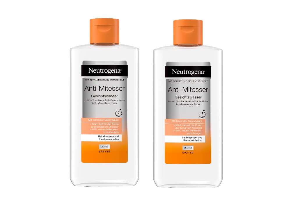 Contents: 2 x 200 ml Neutrogena Visibly Clear anti-blackhead facial water particularly suitable for skin prone to blackheads. The cleansing water has been developed together with dermatologists and skin-friendliness has been dermatologically confirmed. The formula with salicylic acid fights blackheads – supporting a clear and healthy-looking skin complexion. The facial water penetrates deep into the pores and effectively removes dirt and residue that clog the pores. Neutrogena's anti-blackhead facial water supports the removal and prevention of impurities and blackheads deep into the pores, for a pleasant skin feeling.Neutrogena Visibly Clear Anti-mee-eters gezichtswater – Reinigend reinigingswater voor het gezicht tegen onzuiverheden en mee-eters – 1 x 200 ml parentInhoud: 2 x 200 ml Neutrogena Visibly Clear anti-mee-eters gezichtswater bijzonder geschikt voor de naar mee-eters neigende huid. Het reinigingswater is samen met dermatologen ontwikkeld en huidvriendelijkheid dermatologisch bevestigd. De formule met salicylzuur bestrijdt mee-eters – ter ondersteuning van een zuivere en gezond uitziende huidbeeld. Het gezichtswater dringt diep in de poriën door en verwijdert zo effectief vuil en resten, die de poriën verstoppen. Het anti-mee-eters gezichtswater van Neutrogena ondersteunt de verwijdering en preventie van onzuiverheden en mee-eters tot diep in de poriën, voor een aangenaam huidgevoel.