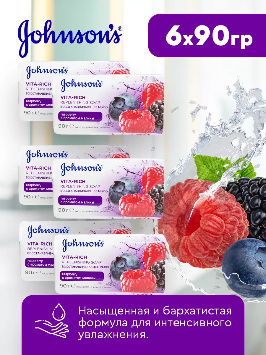 Johnson's Vita-Rich Toilet Soap with Raspberry Extract. This restorative bar soap contains raspberry extract and protective oil, which actively cleanses, softens, and restores the skin of your hands and body, leaving it looking healthy and feeling fresh. This cosmetic soap leaves a delightful, pleasant scent. To use, simply lather your skin and then rinse thoroughly with water. The set contains 6 bars of soap, allowing for economical use at an attractive price. This bar soap with juicy berries gently cleanses the skin without overdrying it.